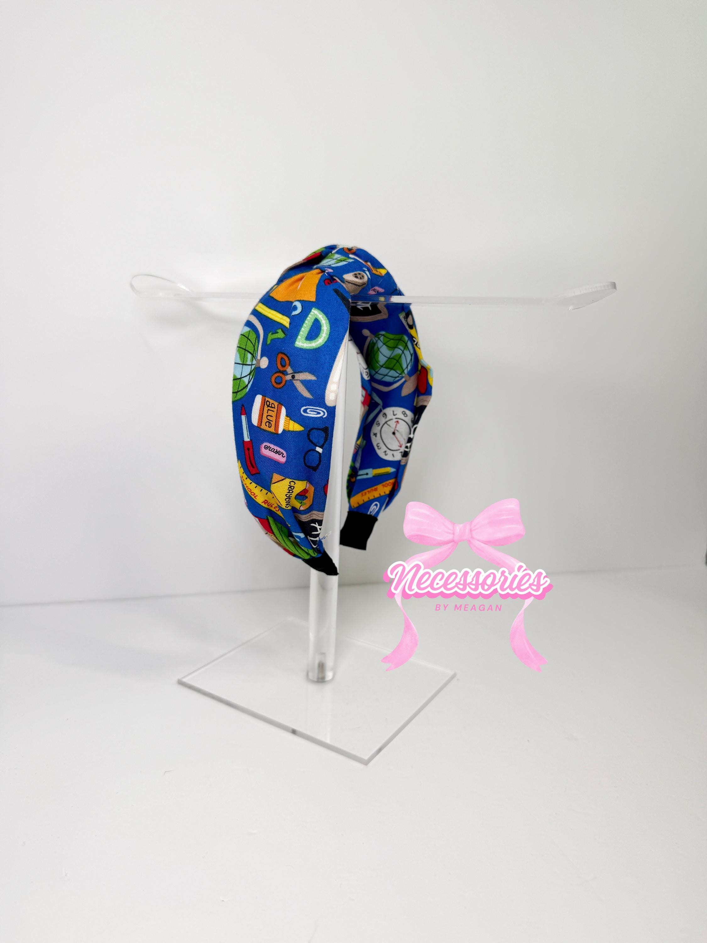 Celebrate learning in style with this Bright School Days Knotted Headband! Bursting with colorful school icons—like notebooks, clocks, rulers, and globes—on a vivid blue background, this headband is perfect for adding a playful pop to your everyday look.