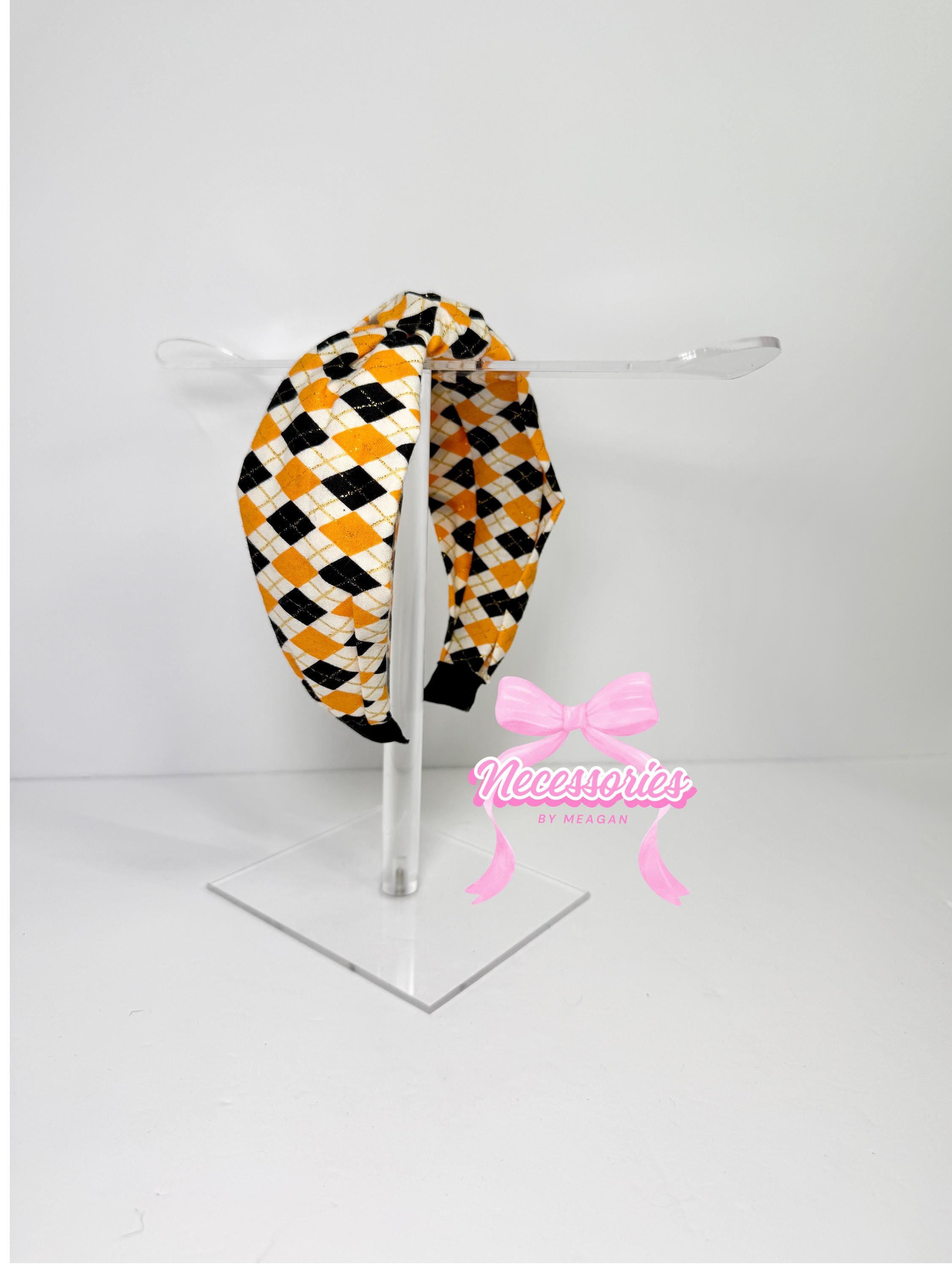 Add a playful twist to your outfit with this Orange, Black & Gold Argyle Knotted Headband! Featuring a classic argyle pattern in bold orange, black, and white with subtle gold threading, this headband brings a preppy yet fun vibe to any look. The knotted top adds texture while the soft band keeps you comfy all day long.