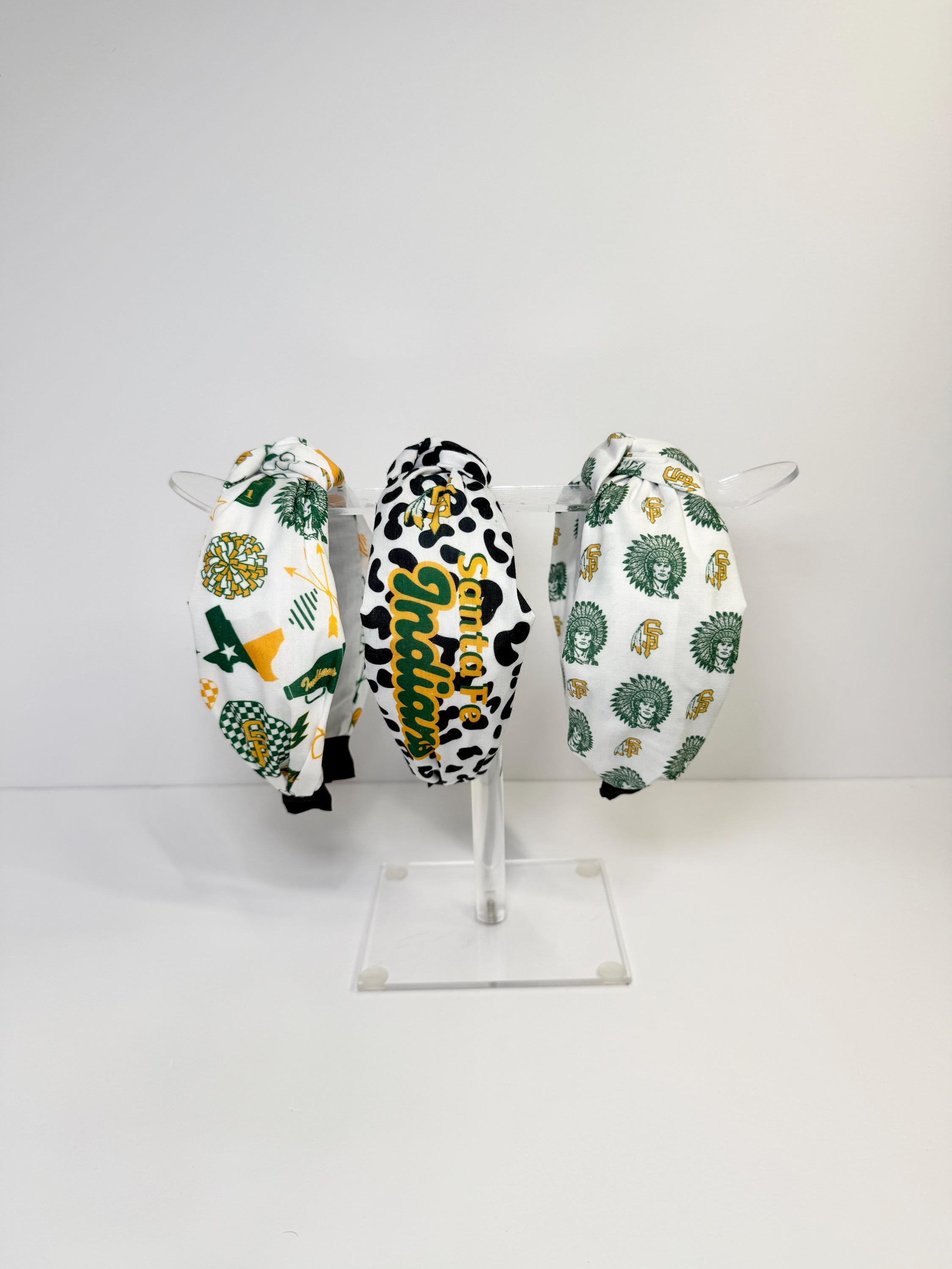 Show your school pride with the Santa Fe Indians Knotted Headbands! Available in three spirited designs—mascot print, cheer-themed, and bold logo mix—each headband features the Indians’ classic green, gold, and white colors. The trendy knotted top adds a stylish twist, while the soft, comfortable fit makes them perfect for game days, pep rallies, or everyday wear to represent your team.
