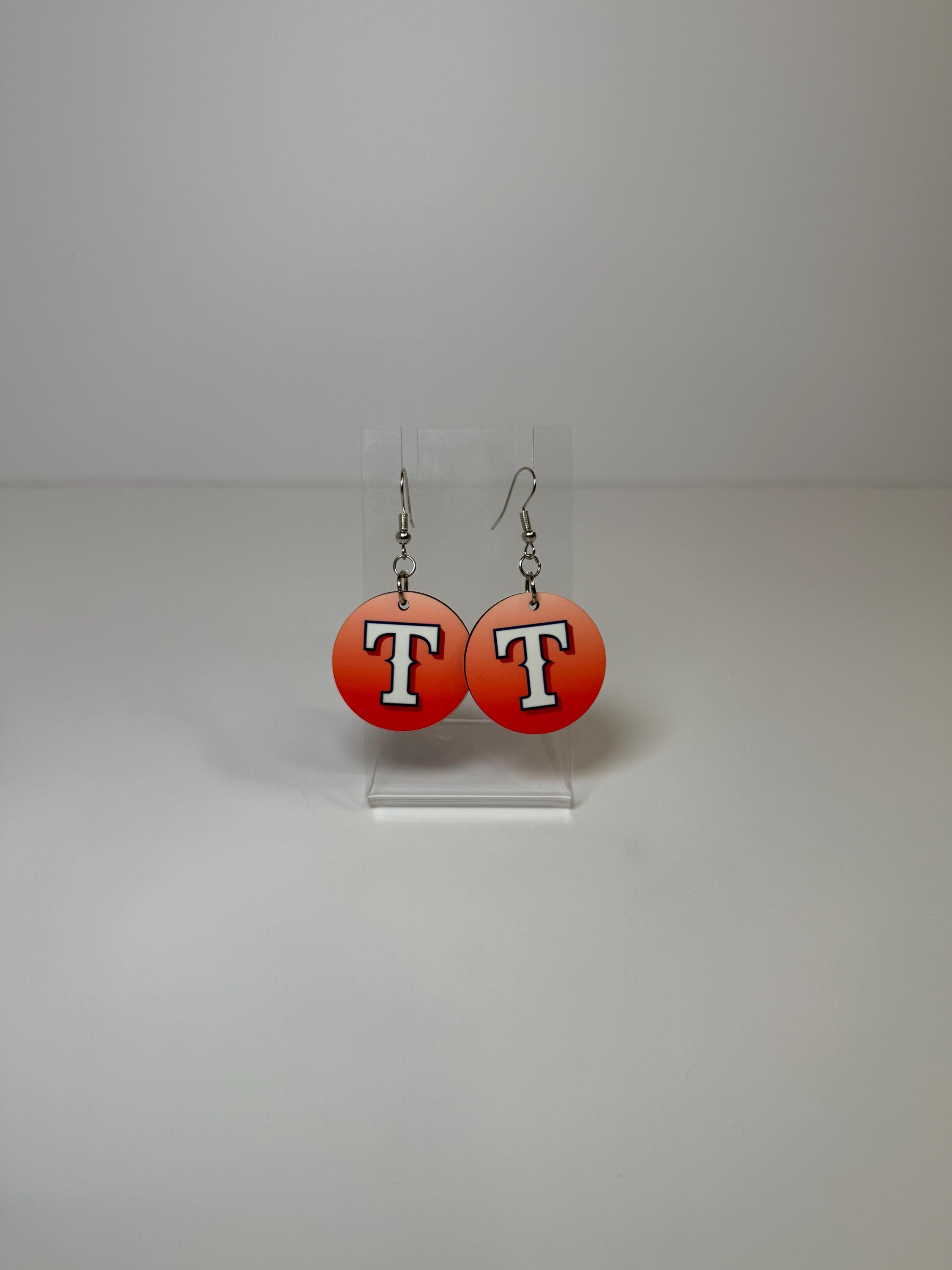 Cheer on the Rangers with these Texas Rangers Earrings! Choose from three spirited designs—orange gradient circles with the red “T” logo, bold blue circles with the Rangers script, or crisp white circles with the red “T” logo. Each pair is lightweight, stylish, and perfect for game days, watch parties, or adding a sporty pop to your everyday style. Available with either gold or silver hardware so you can match your personal look.
