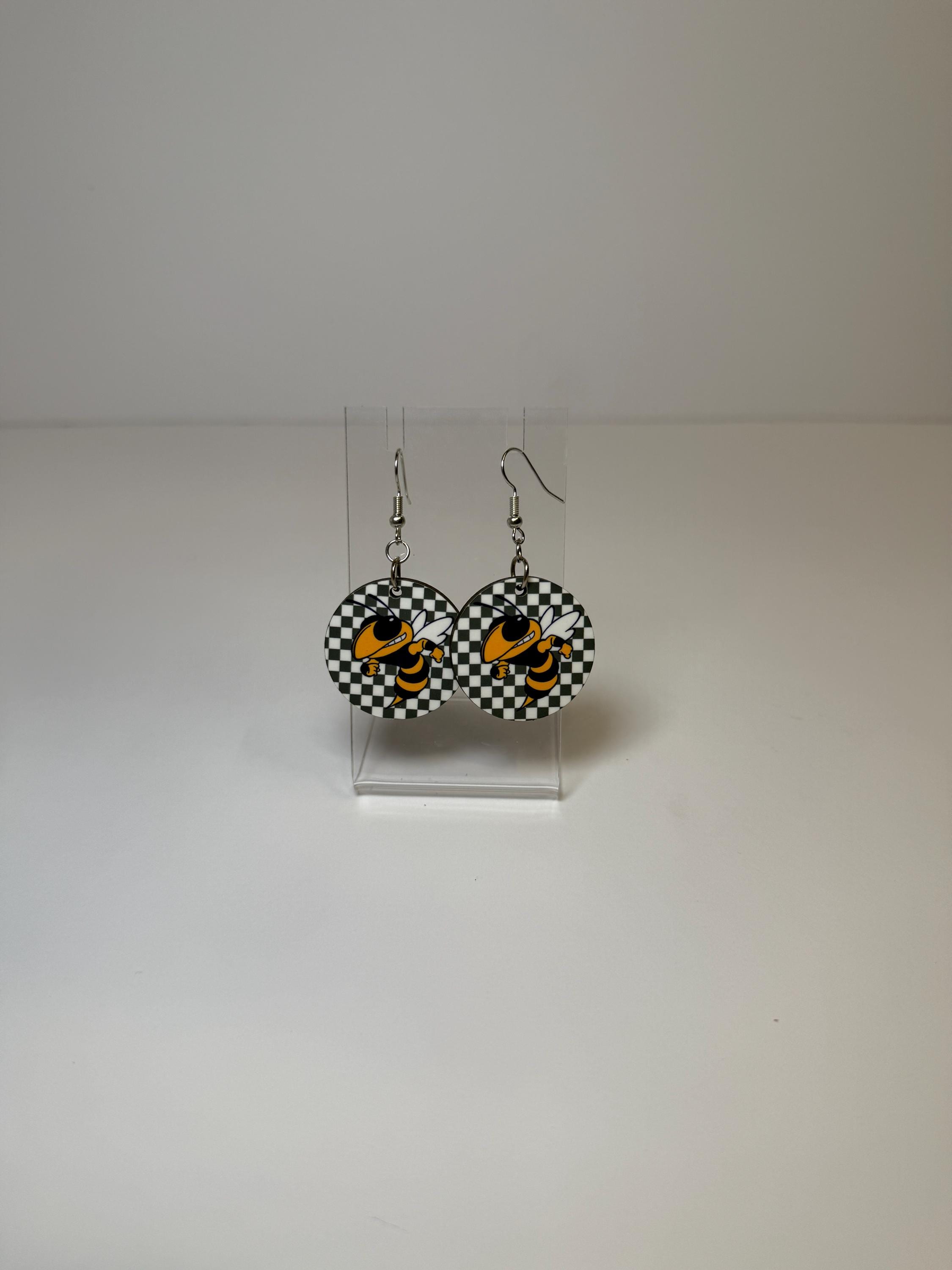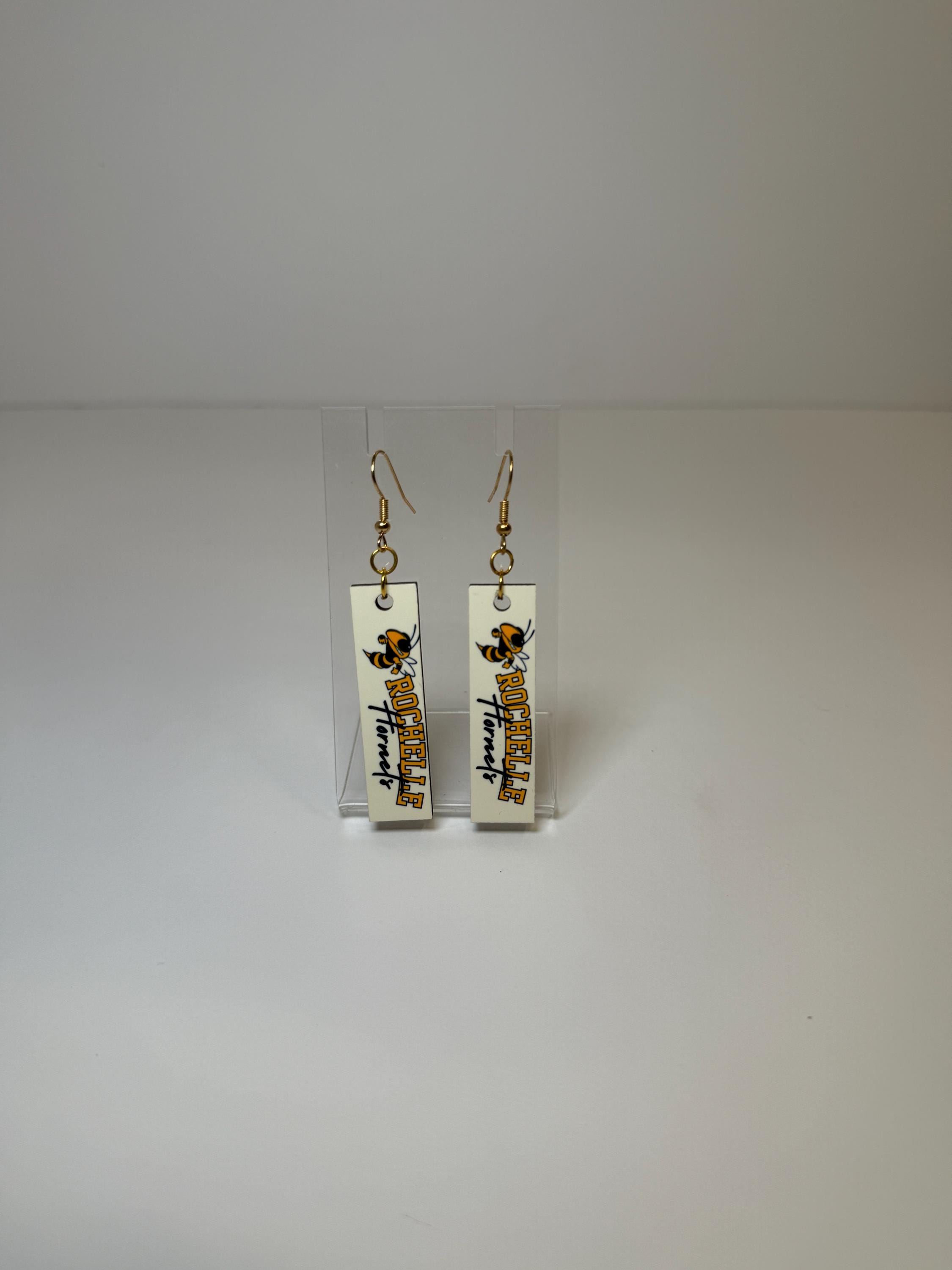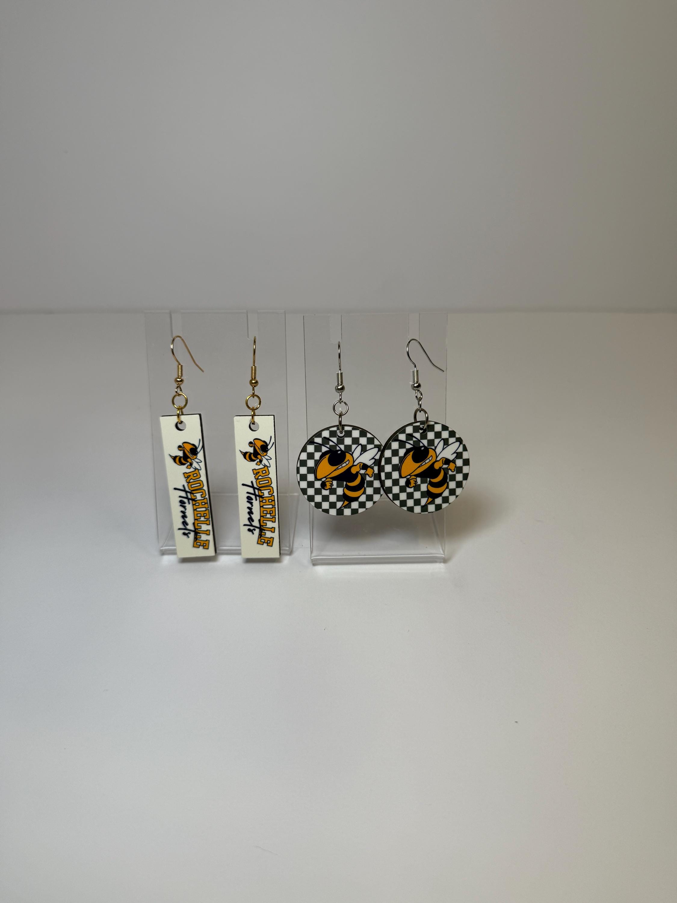 Show your Hornet pride with these Rochelle Hornets Earrings! Choose from two spirited designs—black-and-white checkered circles with the Hornet mascot or sleek white rectangle drops with “Rochelle Hornets” text and logo. Both styles are lightweight, comfortable, and perfect for game days, pep rallies, or everyday wear. Available with either gold or silver hardware for both designs so you can match your style perfectly.