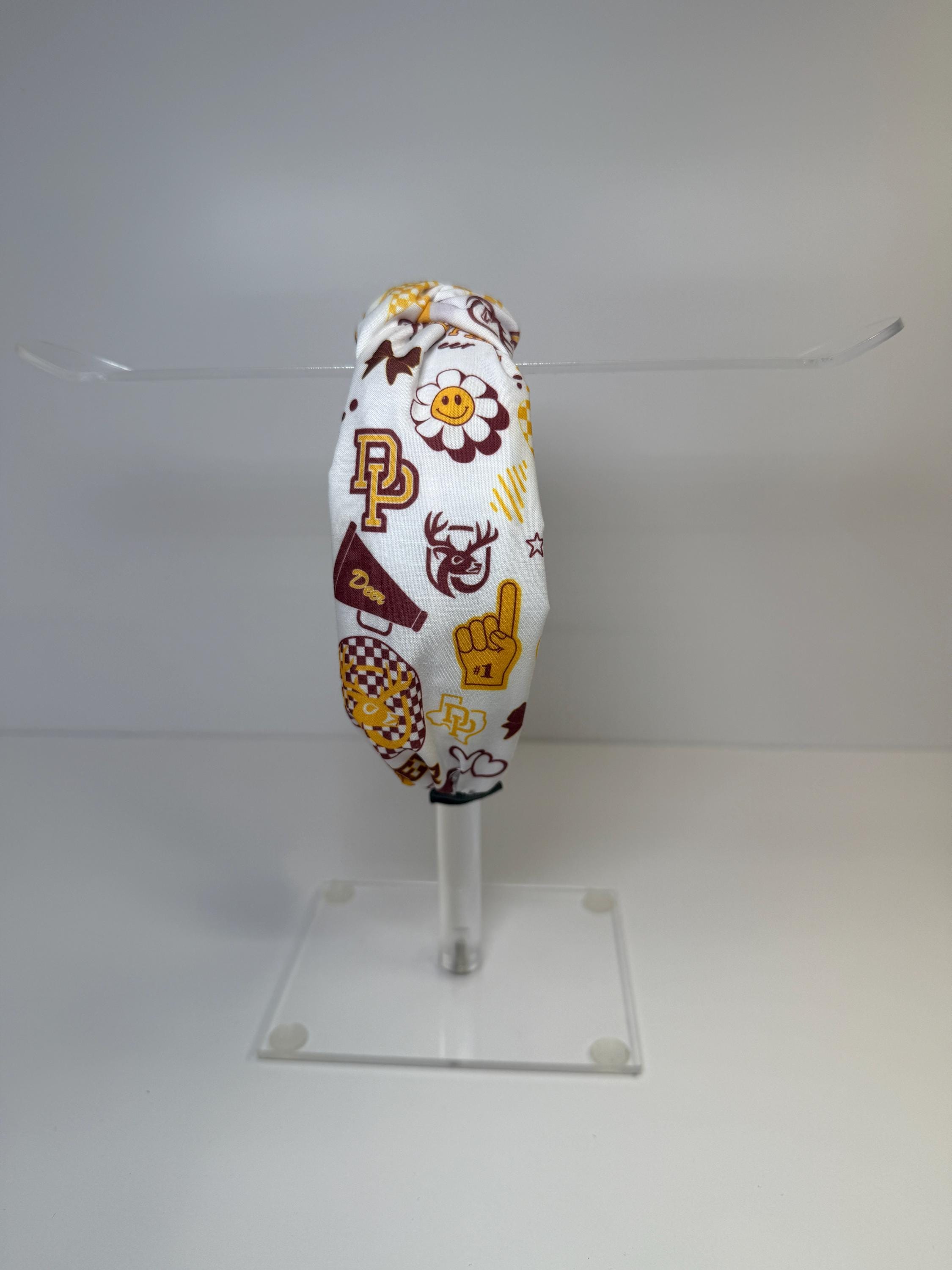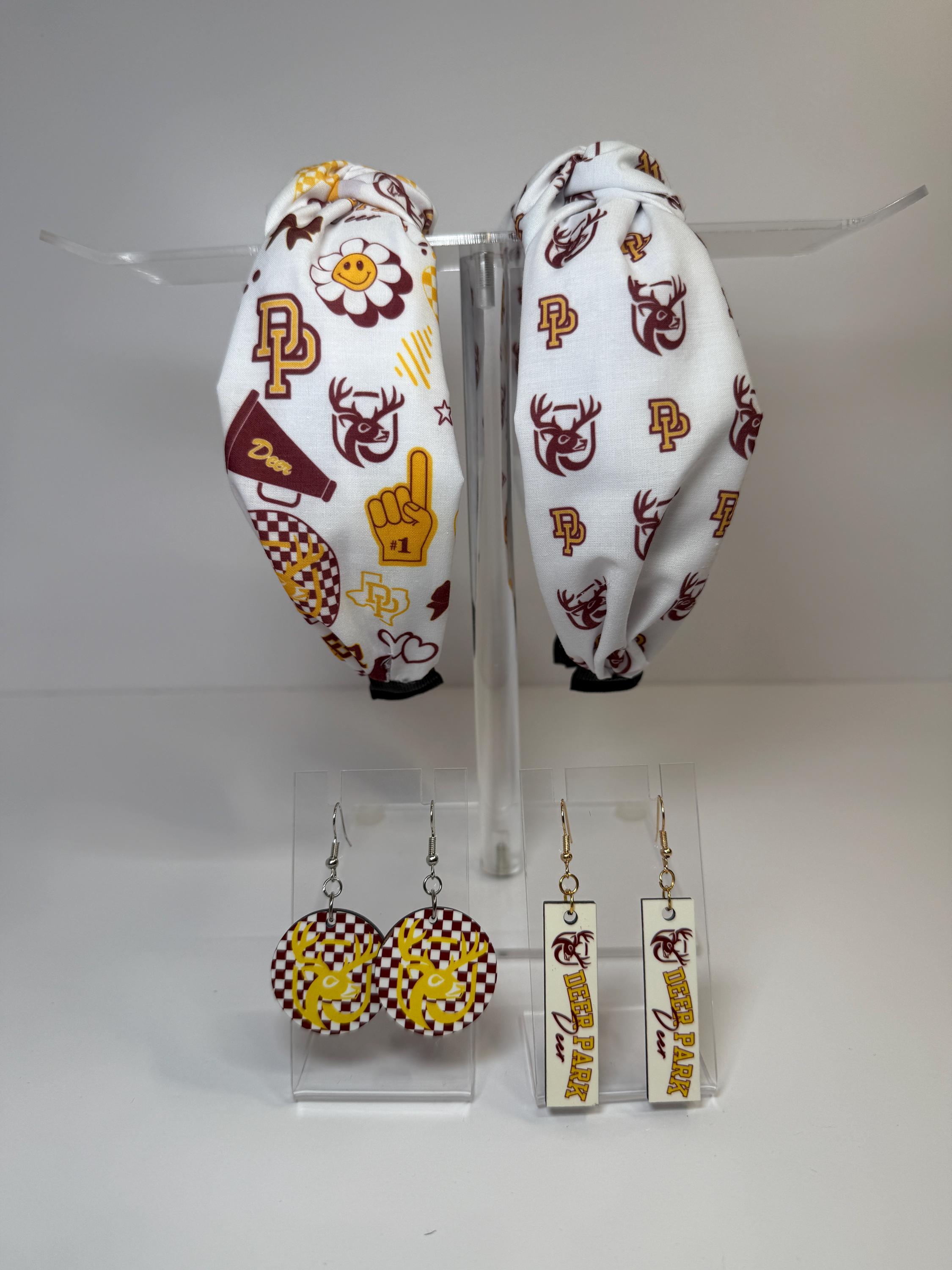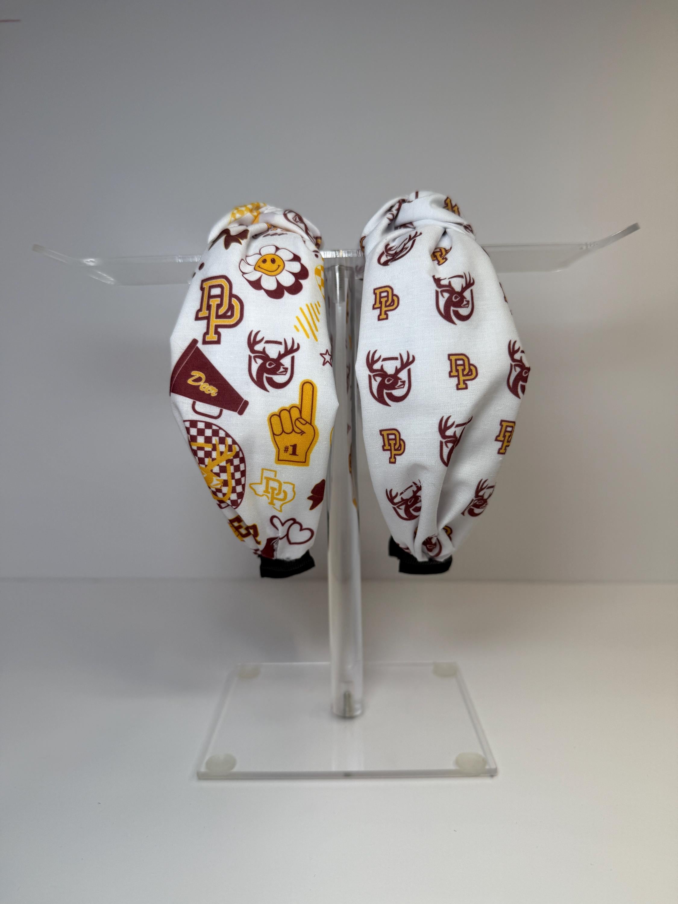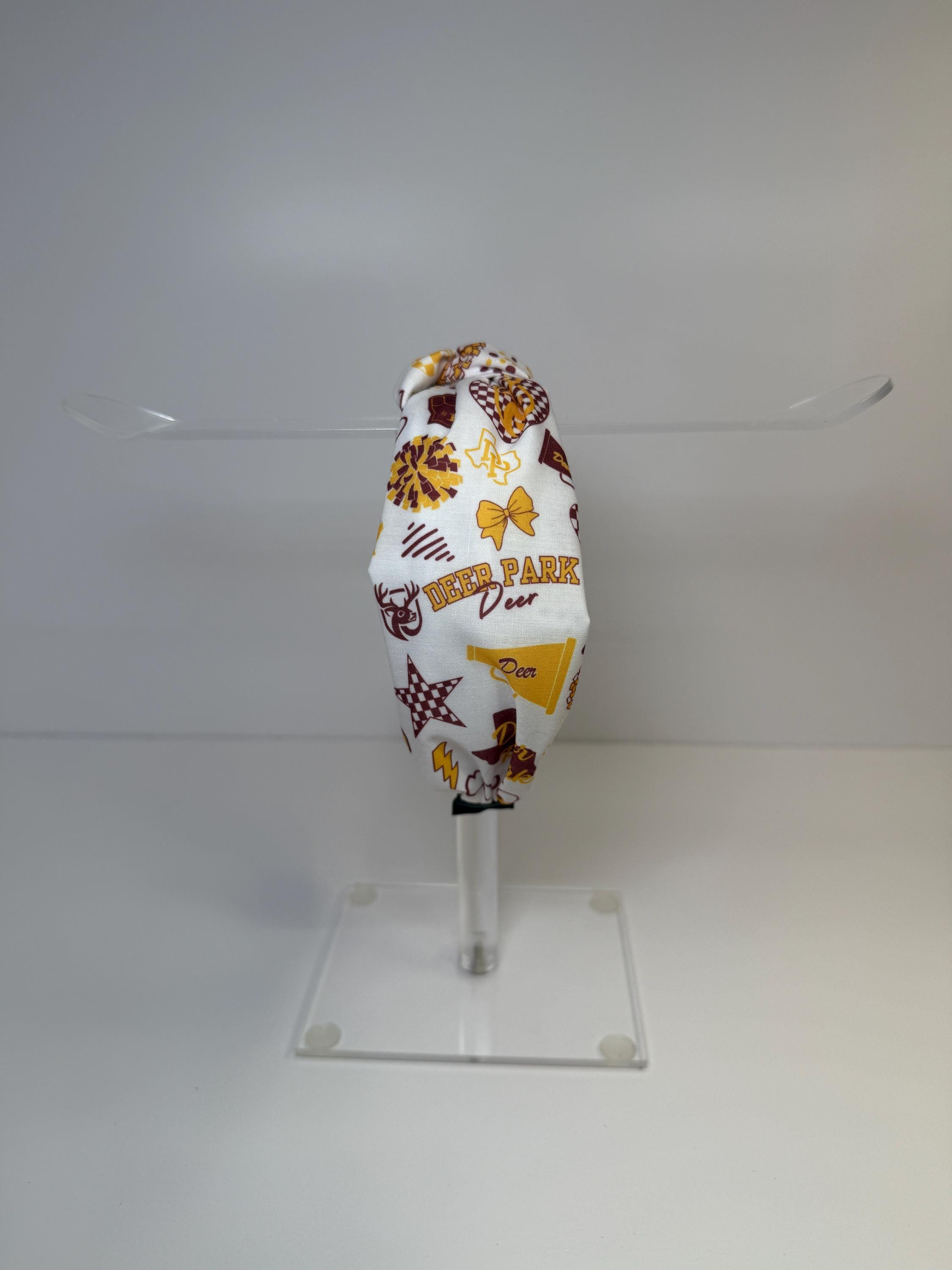 Cheer on your team in style with the Deer Park Deer Knotted Headbands! Available in two spirited designs—logo print and cheer-themed—each headband features the Deer Park colors of maroon, gold, and white. The trendy knotted top adds a fashionable twist, while the soft, stretchy fit makes them perfect for game days, pep rallies, or everyday wear to show off your Deer pride.