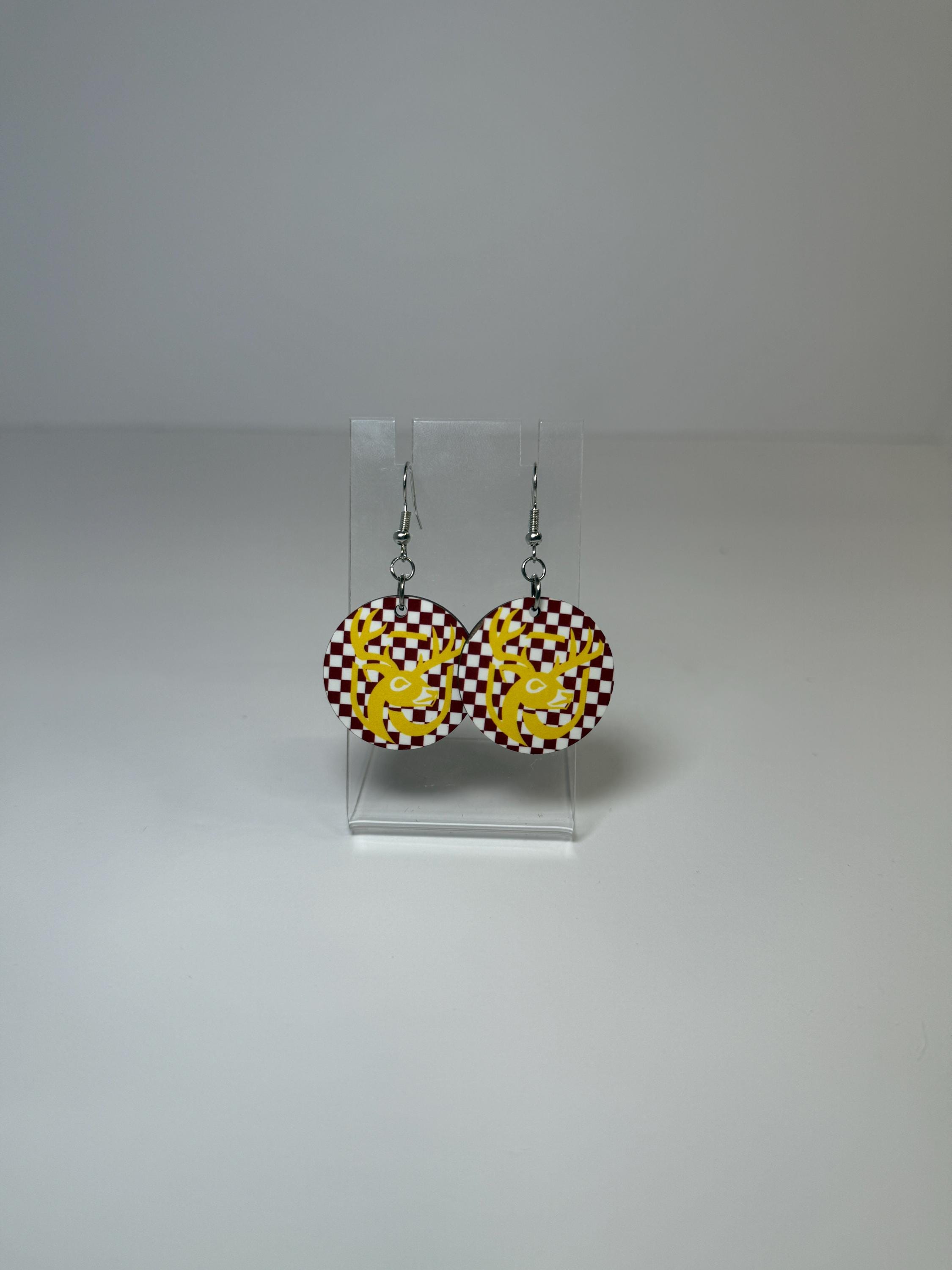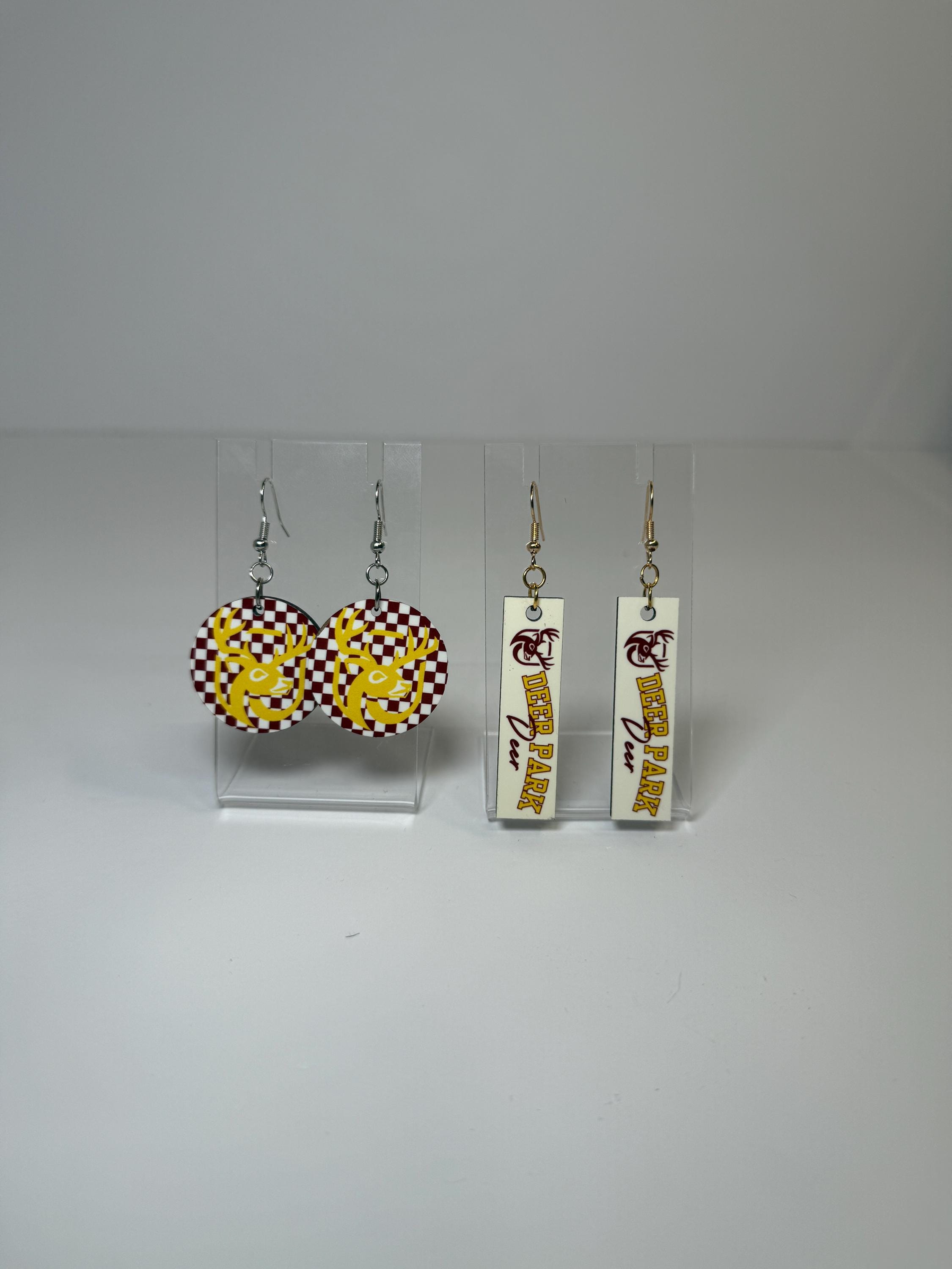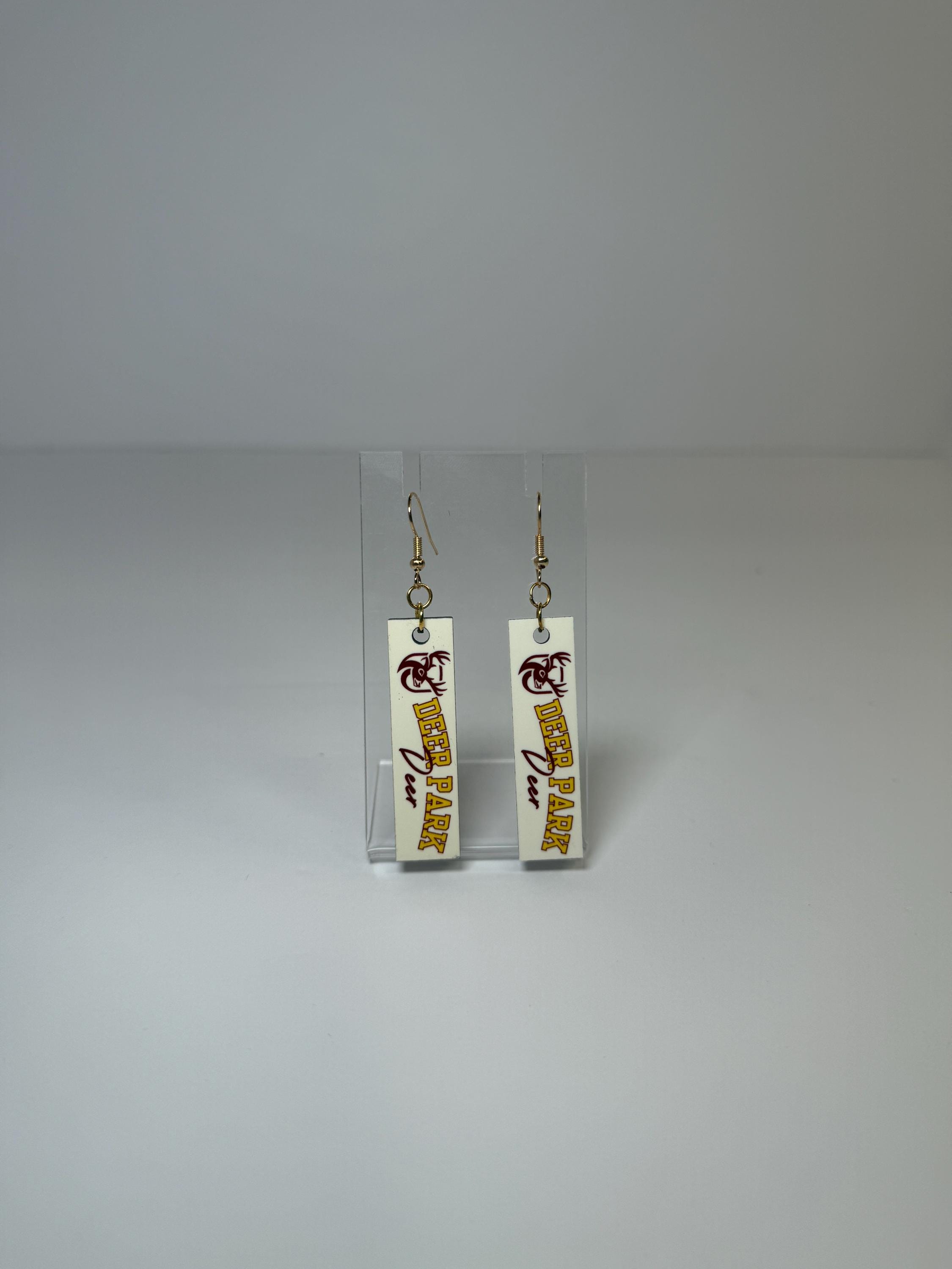 Show your Deer Park pride with these spirited Deer Park Deer Earrings! Choose from two bold designs—maroon-and-gold checkered circles with the Deer mascot or sleek white rectangle drops with “Deer Park Deer” text and logo. Both styles are lightweight, comfortable, and perfect for game days, pep rallies, or adding a stylish touch of school spirit to your everyday look. Available with either gold or silver hardware for both designs so you can match your style perfectly.