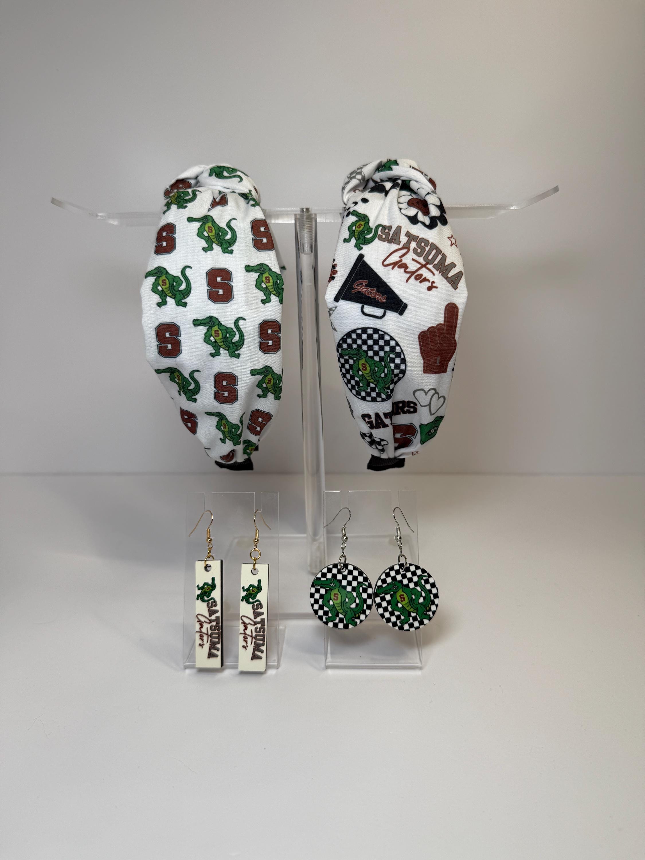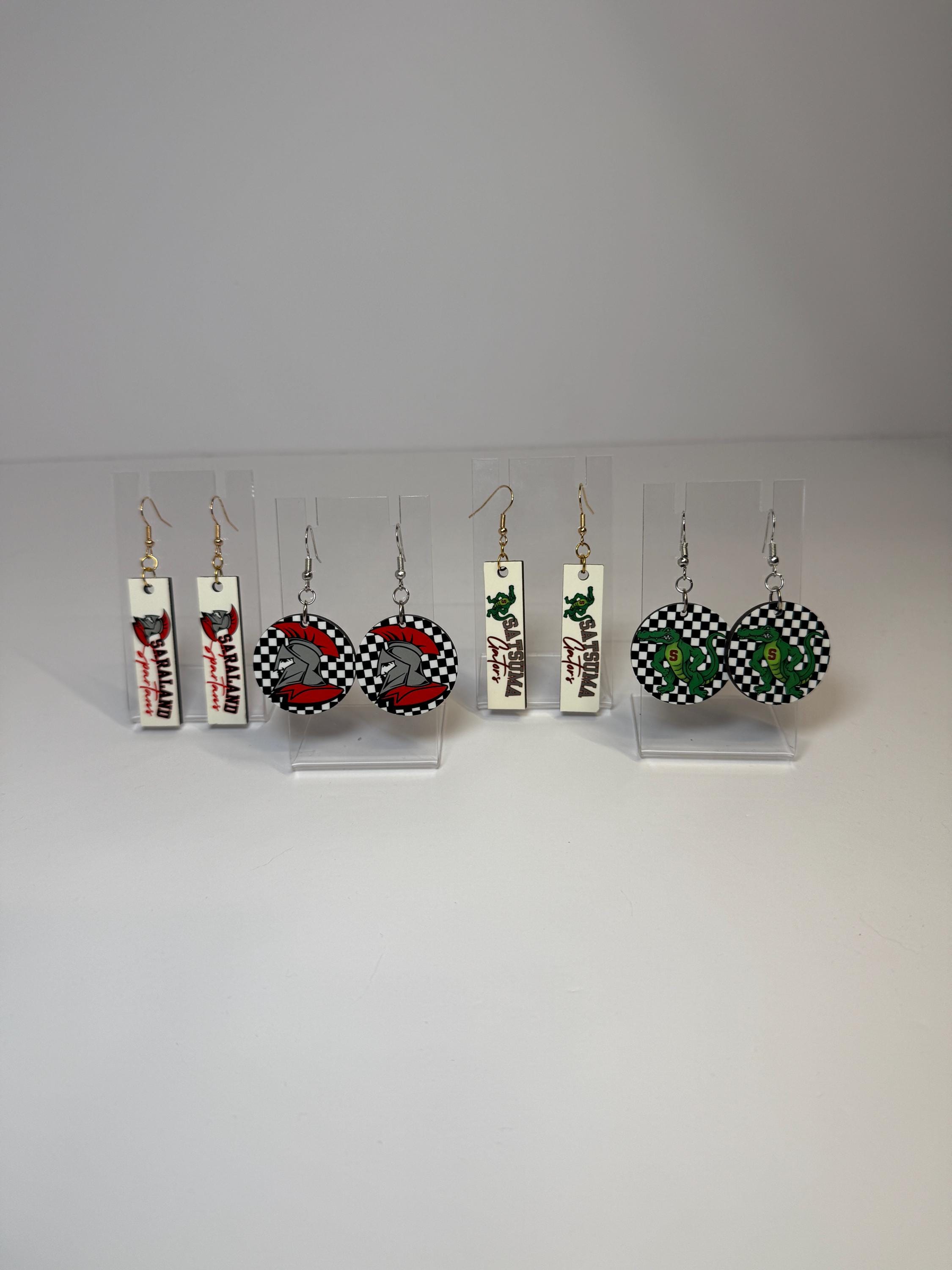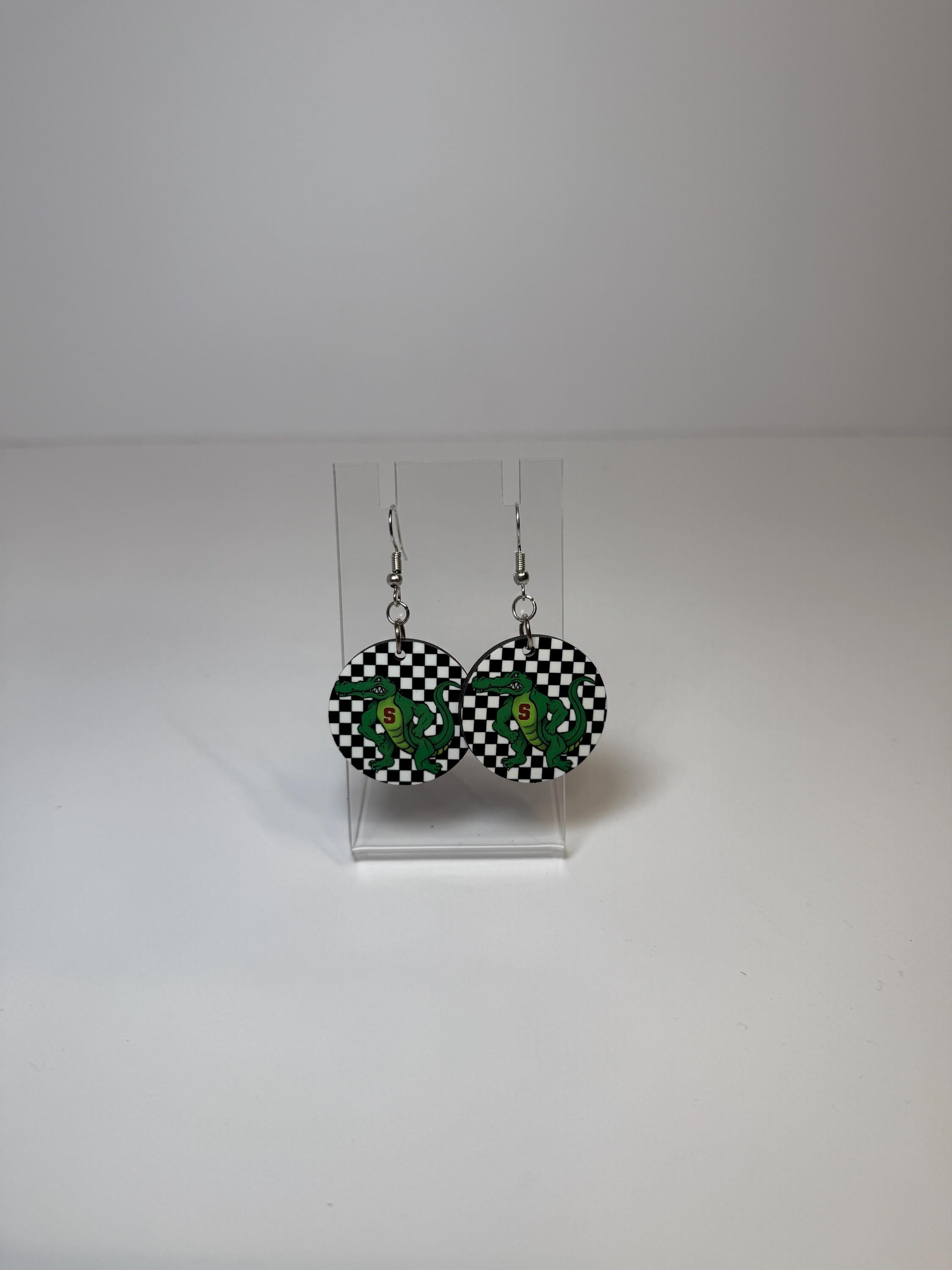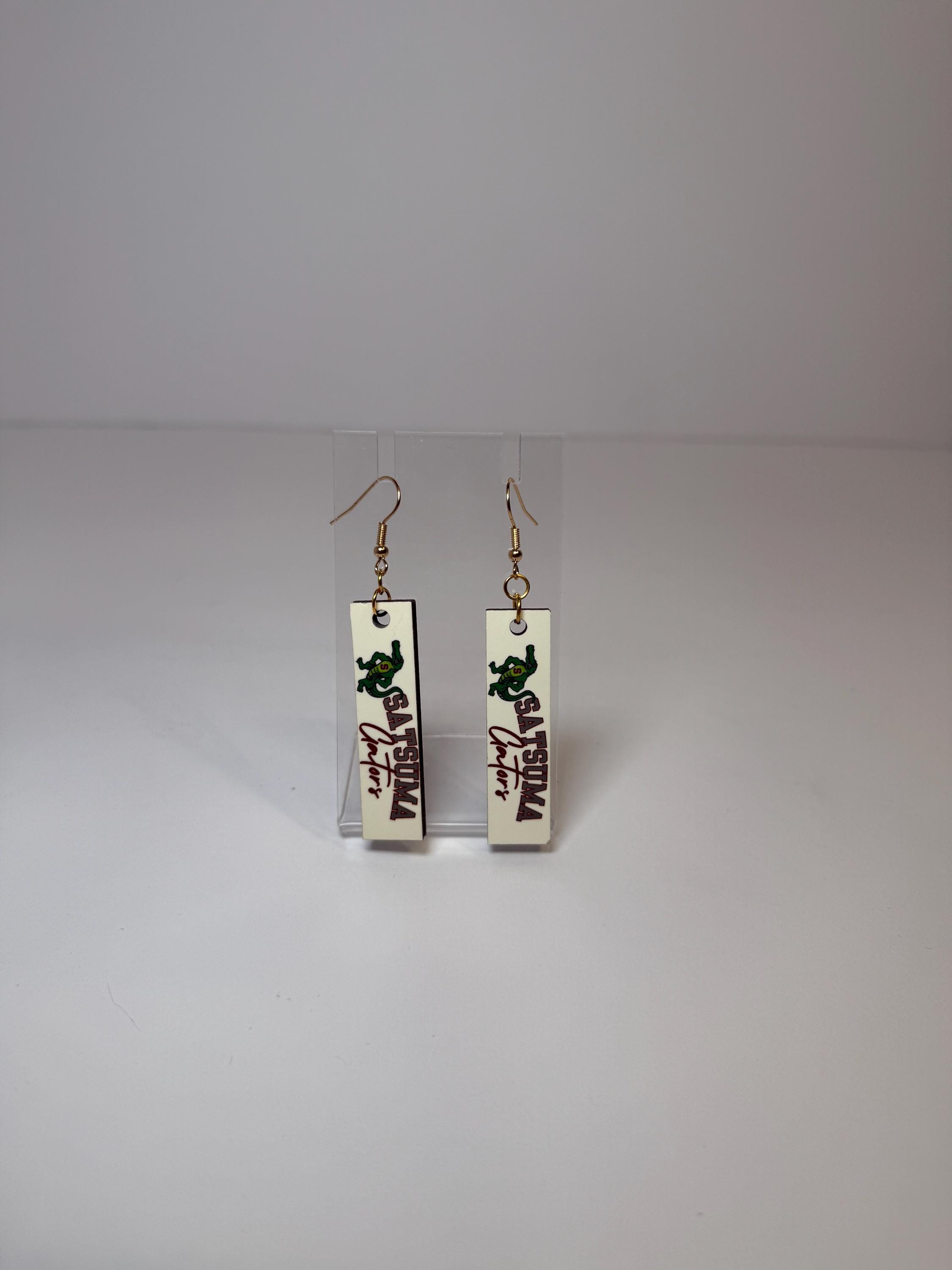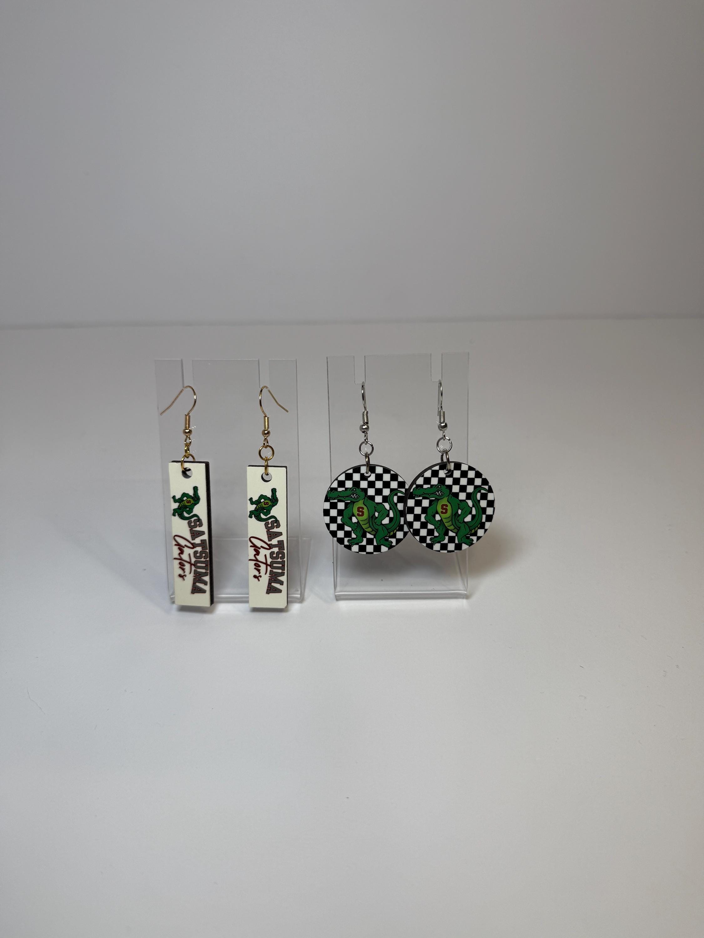 Cheer on the Gators with these spirited Satsuma Gators Earrings! Choose from two bold designs—black-and-white checkered circles with the Gators mascot or sleek white rectangle drops with “Satsuma Gators” text and logo. Both styles are lightweight, comfortable, and perfect for game days, pep rallies, or adding a fun touch of school spirit to your everyday look. Available with either gold or silver hardware for both designs so you can match your style perfectly.
