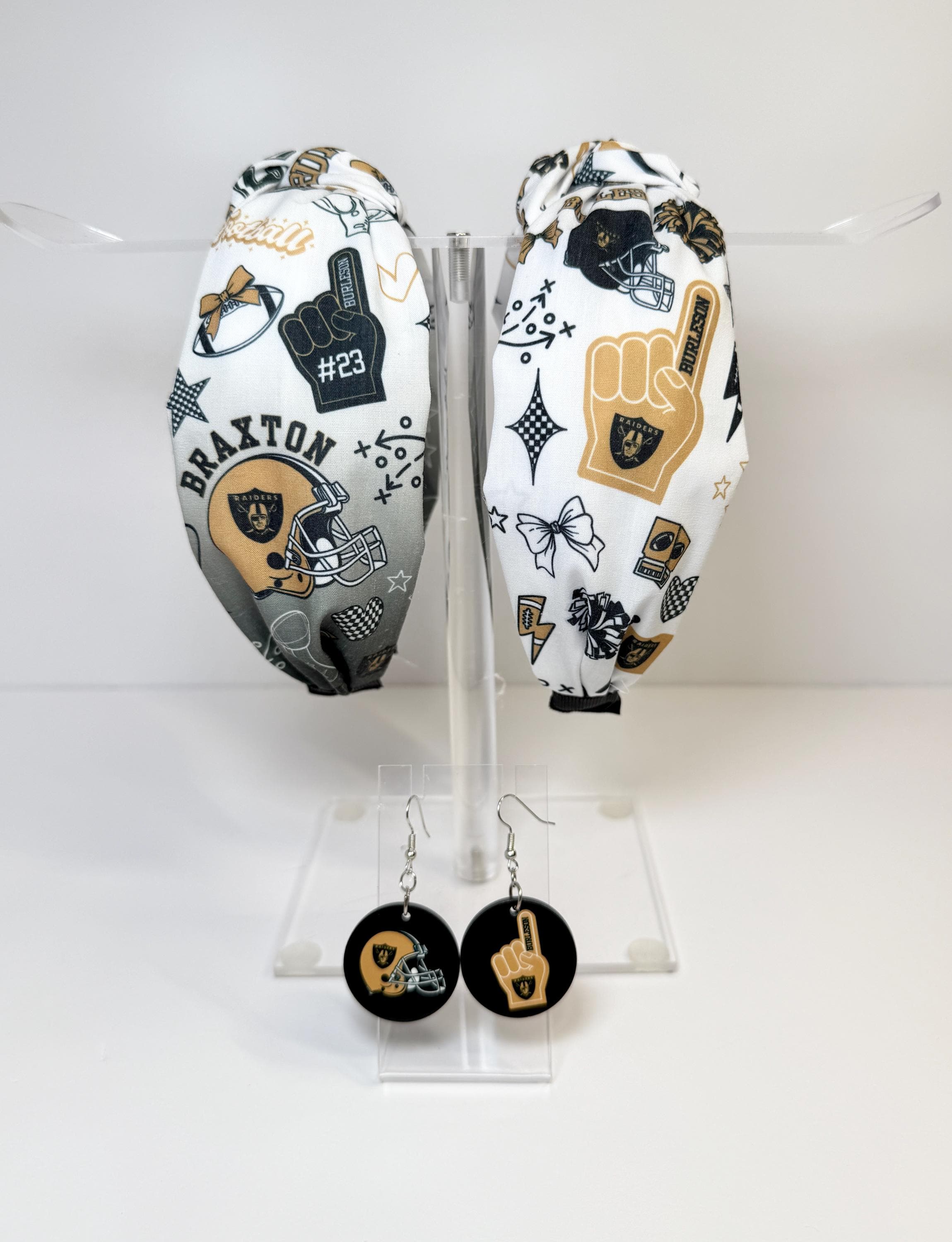 Cheer on the Raiders in style with the Burleson Raiders Earrings! Featuring bold black-and-gold designs with spirited icons like football helmets and foam fingers, these earrings are perfect for showing off your school pride. Lightweight and comfortable, they’re great for game days, pep rallies, or everyday wear. Plus, personalization is available—add a name, jersey number, or special touch to make them uniquely yours or a thoughtful gift for your favorite Raiders fan!