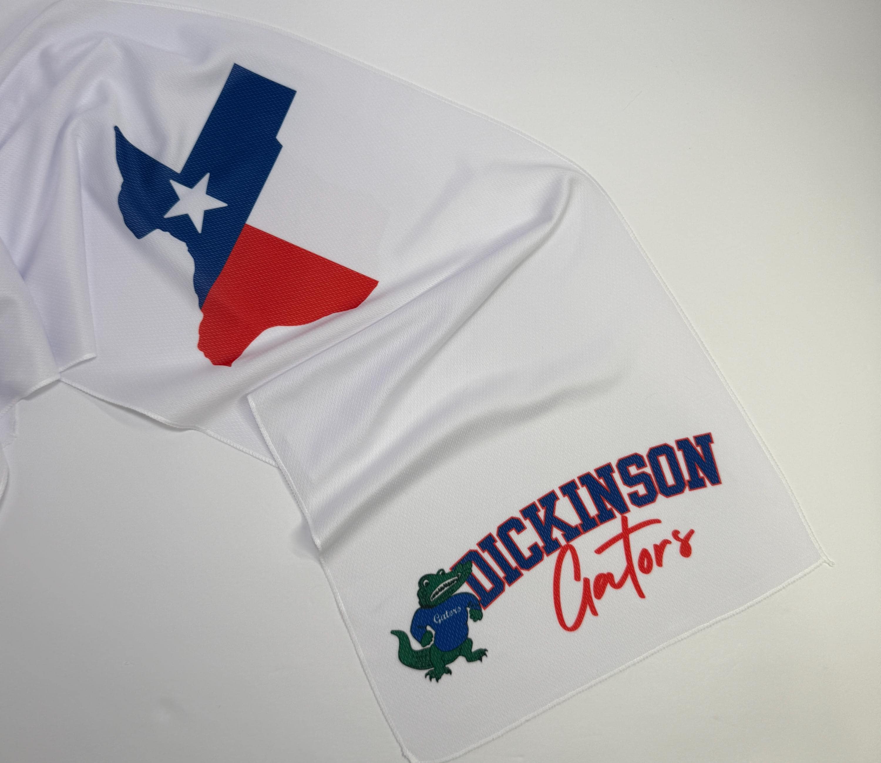 Beat the heat while cheering on the Gators with this Dickinson Gators cooling towel! Designed with the Texas flag-inspired state outline and the bold Gators logo, this towel combines team spirit with functionality. Sized at 40" L x 12" W, it’s perfect for instant cooling relief—just wet, wring, and snap to activate. Whether at the game, practice, or working out, this towel keeps you cool while representing Dickinson pride.
