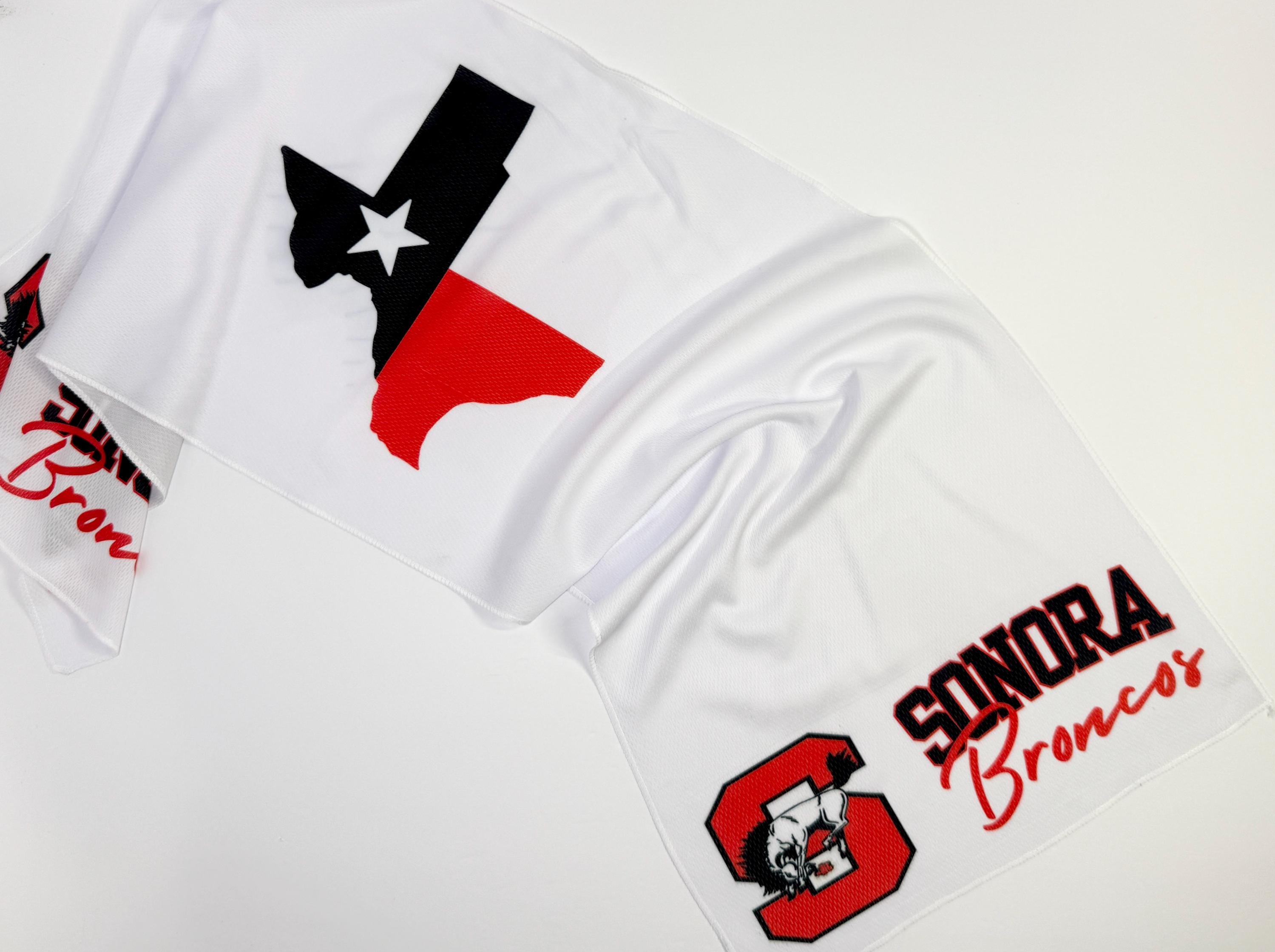 Cheer on the Sonora Broncos in comfort and style! This cooling towel features bold team graphics along with a Texas state design, making it the perfect game day accessory. Measuring 40" L x 12" W, it’s lightweight, breathable, and designed to keep you cool—just wet, wring, and snap to activate the cooling technology. Whether you’re at the field, gym, or out in the Texas heat, this towel has you covered!