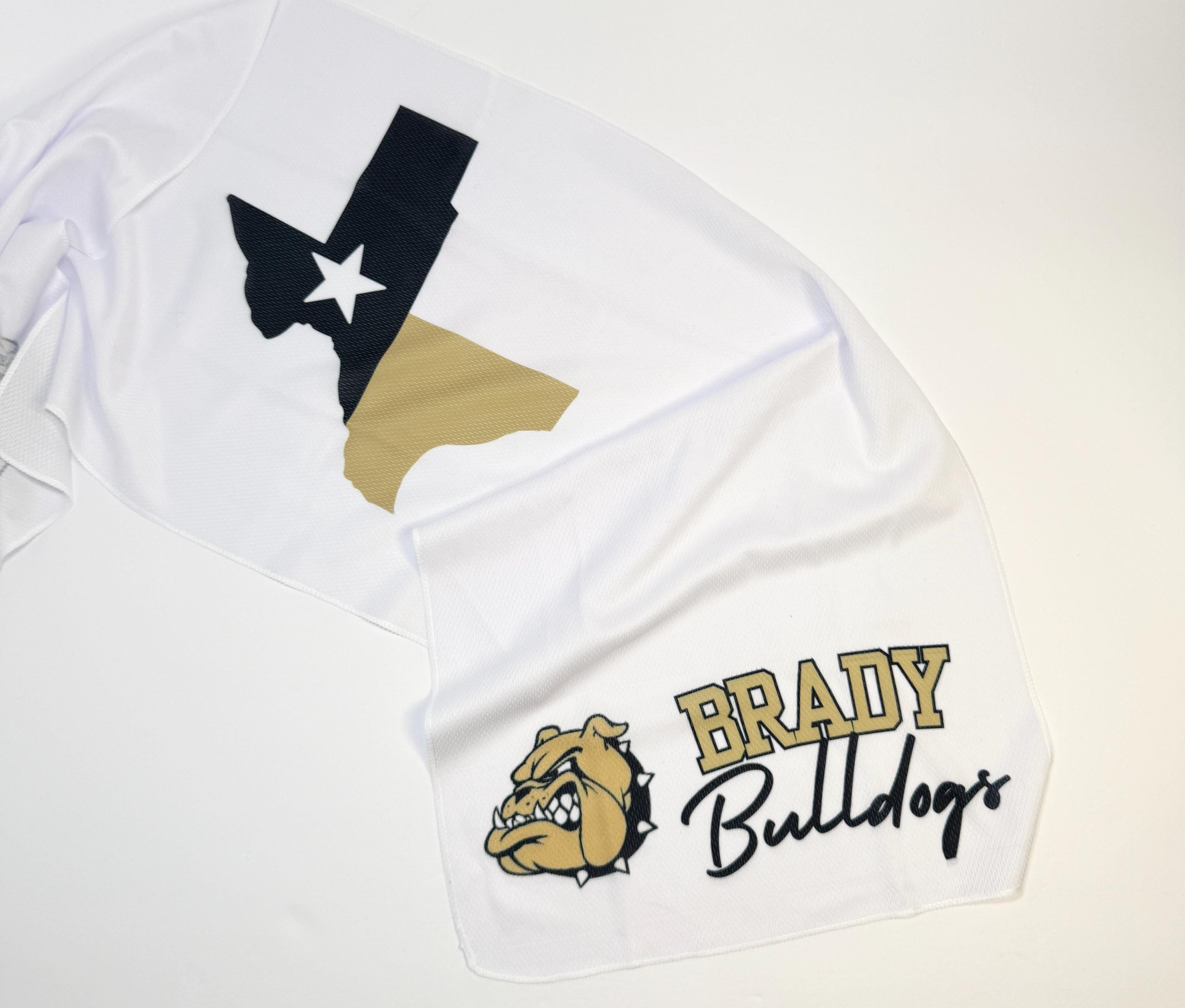 Beat the heat and support the Brady Bulldogs with this stylish cooling towel! Featuring the bold Brady Bulldogs logo and lettering along with a Texas state design in black and gold, this 40" L x 12" W towel is the perfect fan accessory. Simply wet, wring, and snap to activate the cooling effect—ideal for workouts, sports, or cheering from the stands.