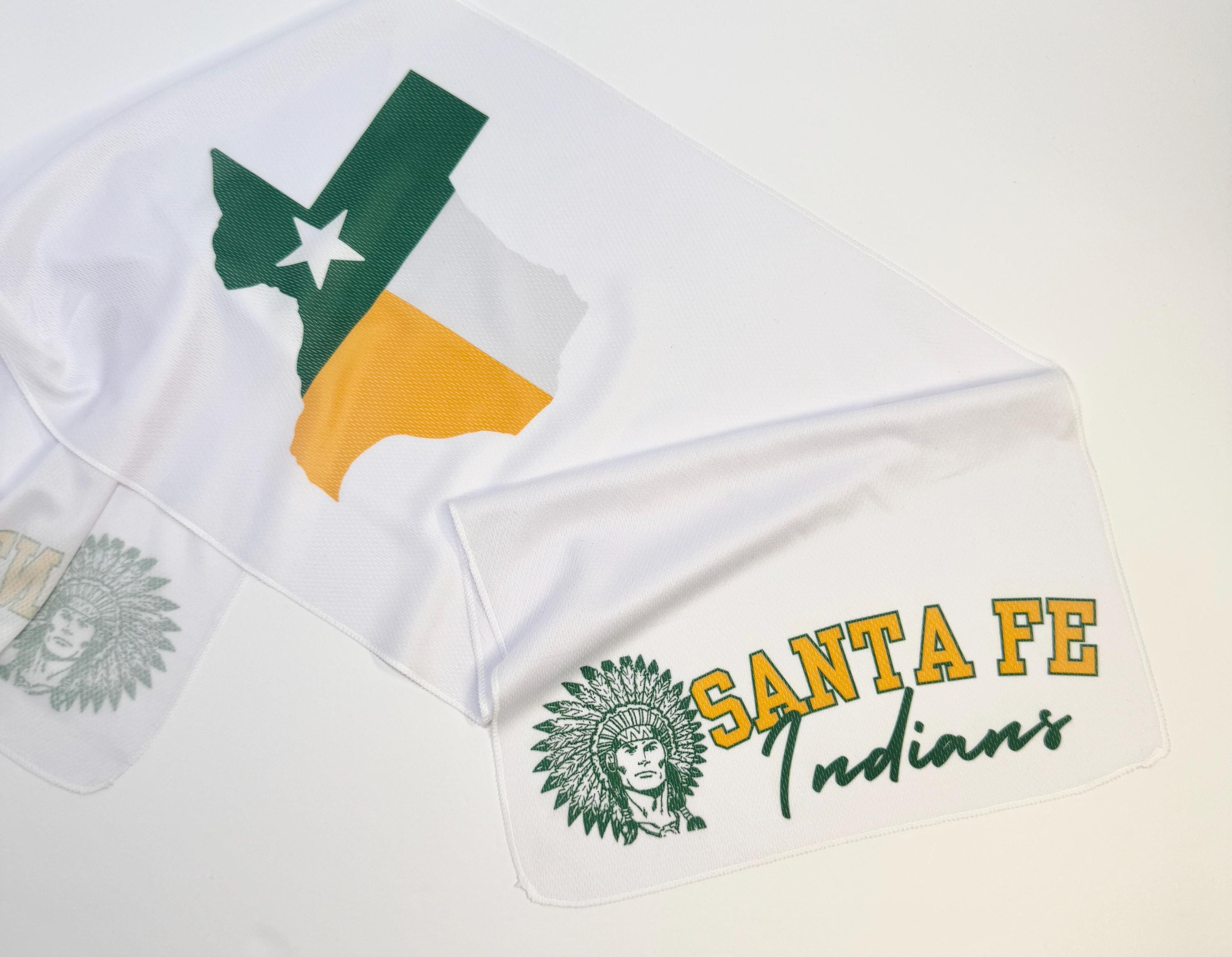 Stay cool while showing your Santa Fe spirit! This Indians cooling towel features a bold Texas outline with the school’s colors and logo, making it perfect for games, workouts, or any outdoor activity. Simply wet, wring, and snap to enjoy instant cooling relief while representing your team.
