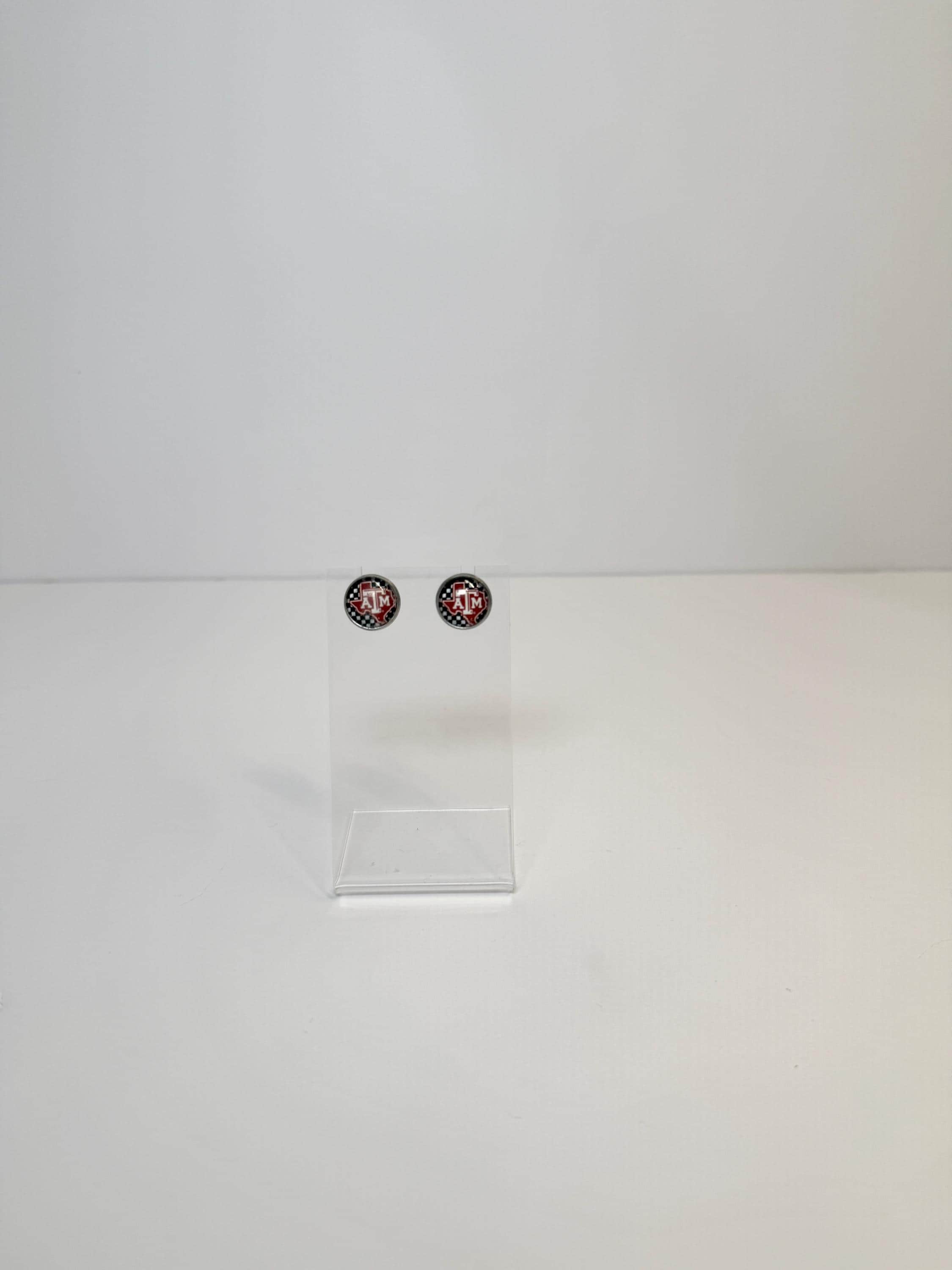 Gig ’Em, Aggies! These Texas A&M stud earrings feature the bold maroon ATM logo on a sleek black checkered background. Lightweight and stylish, they’re the perfect way to show your school pride whether you’re at Kyle Field or out and about in Aggieland.