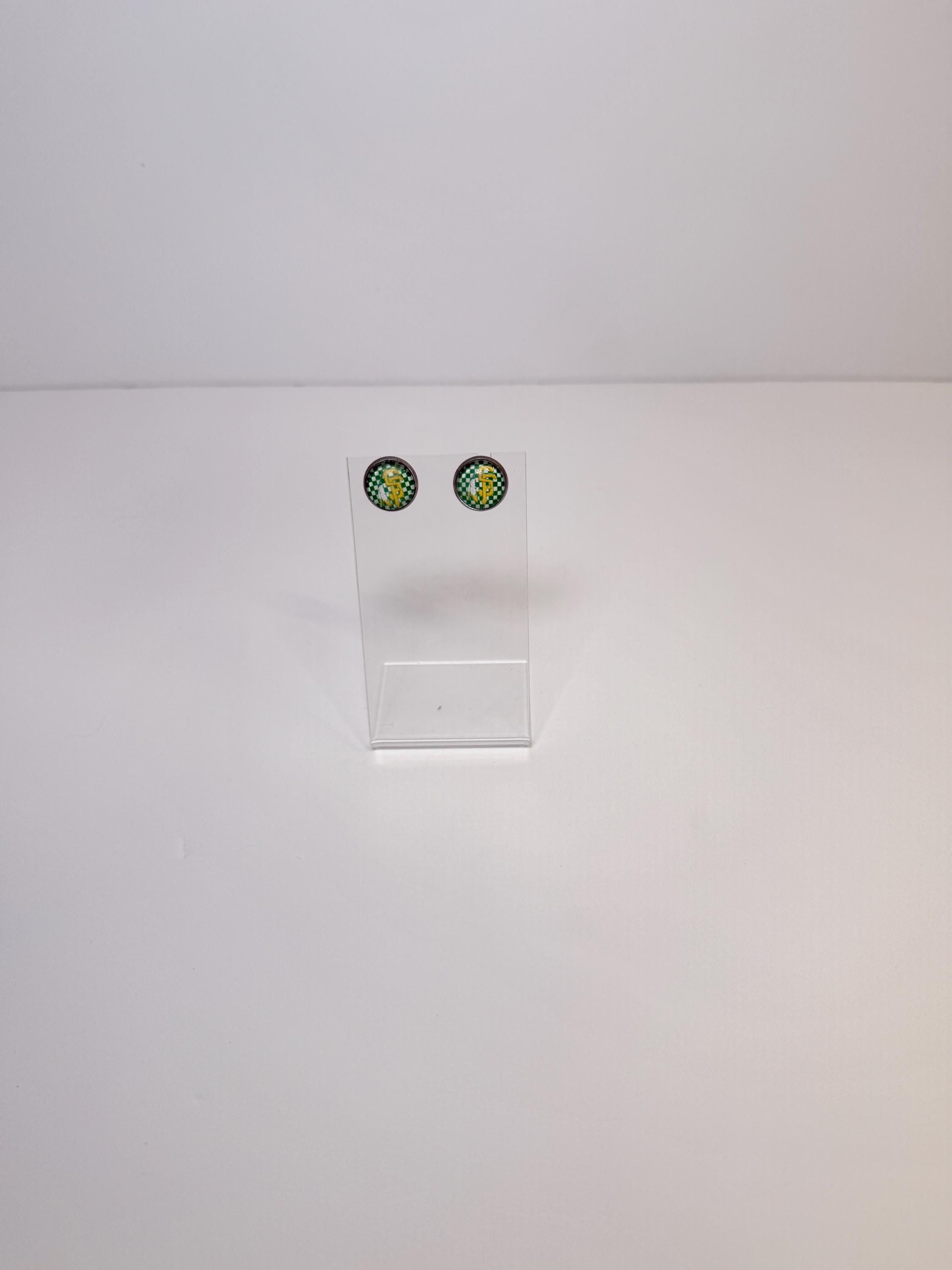 Show your Santa Fe spirit with these unique Santa Fe Indians stud earrings! Featuring the iconic Indian mascot with a bold green checkered background, these lightweight studs are perfect for everyday wear or cheering on your team in style.