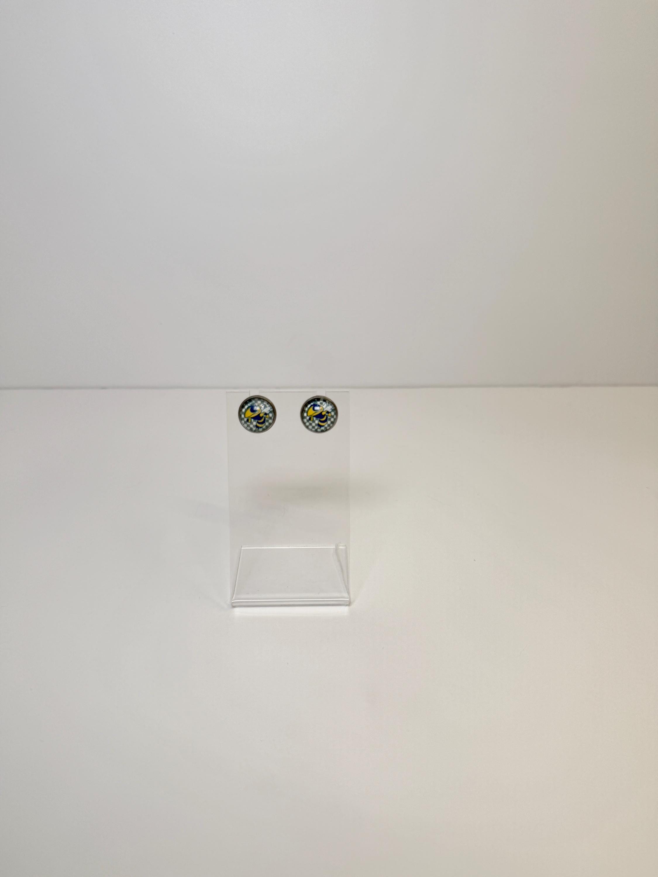 Show off your school spirit with these Rochelle Hornets stud earrings! Featuring the Hornets mascot on a bold checkered background, these lightweight studs are perfect for game day, pep rallies, or everyday wear to represent your team with pride.