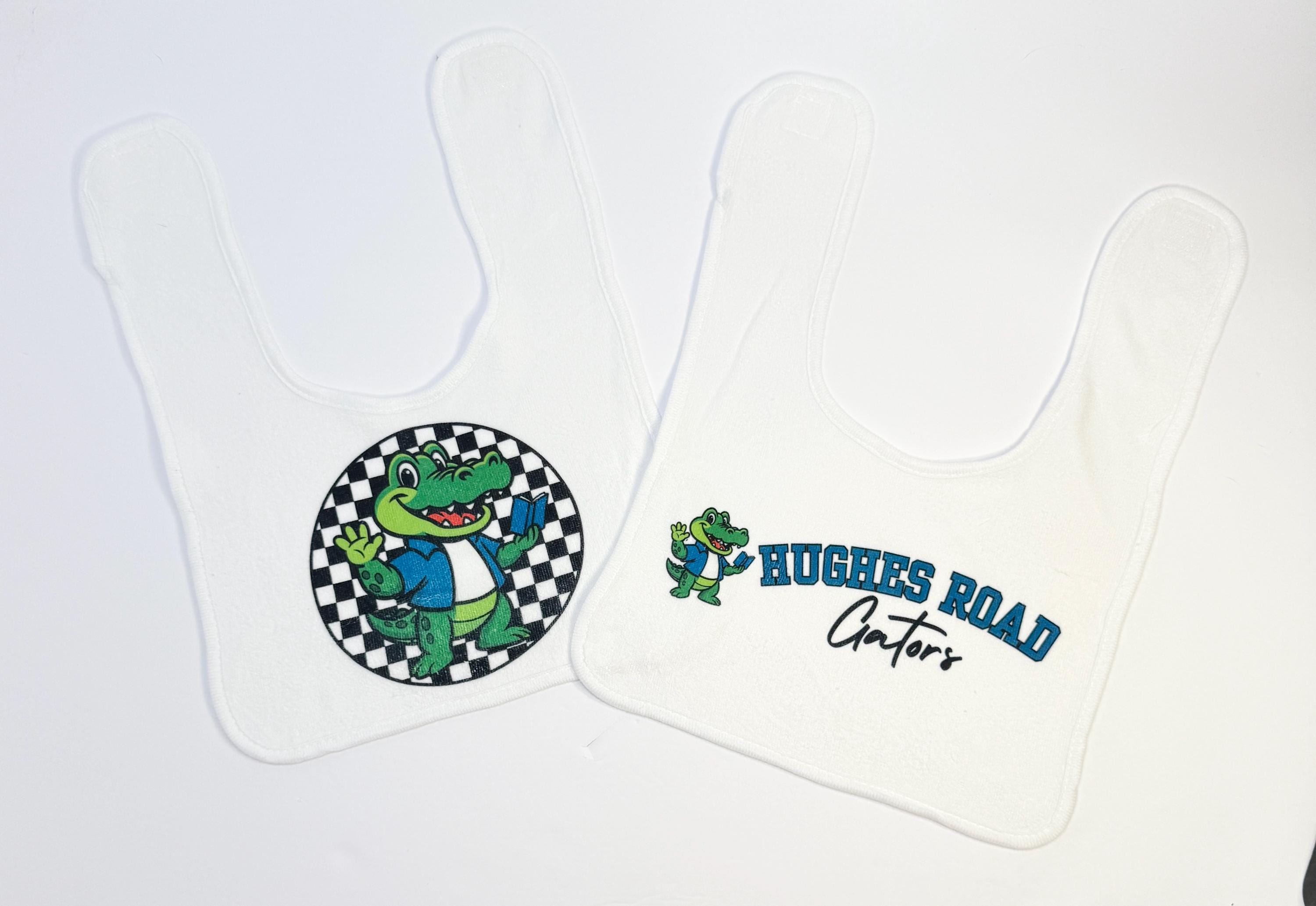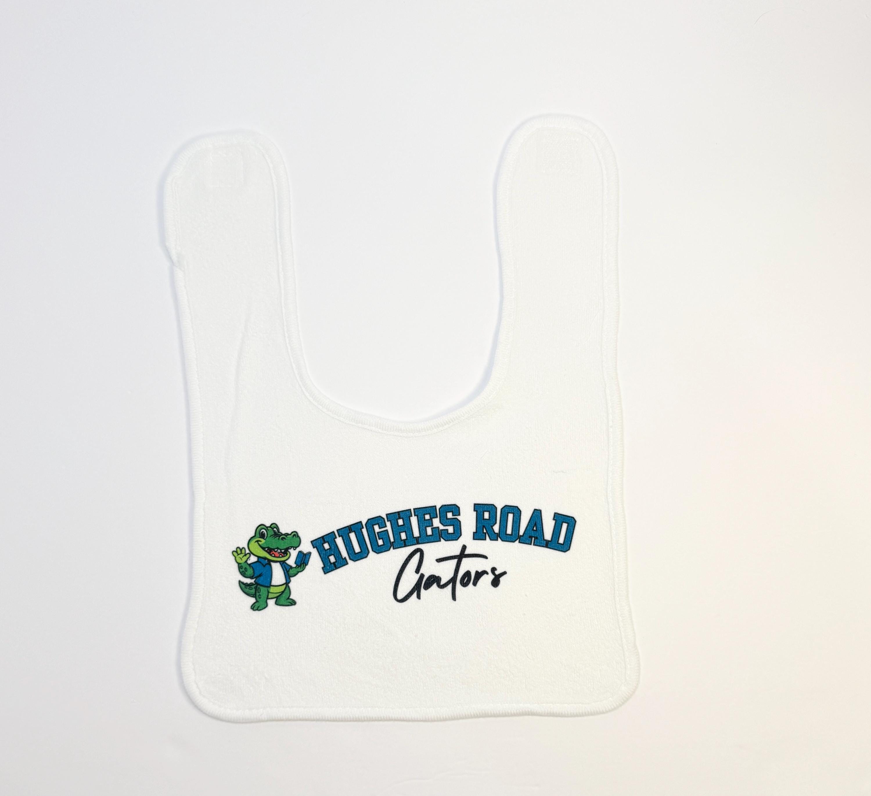 Keep your little Gator mess-free and full of school spirit with these Hughes Road Elementary Baby Bibs! Each bib features the adorable Hughes Road Gators design, perfect for supporting your favorite school from day one. Soft, absorbent, and easy to clean, these bibs make both mealtime and playtime extra special. Designed and printed by hand right here in my home workshop!