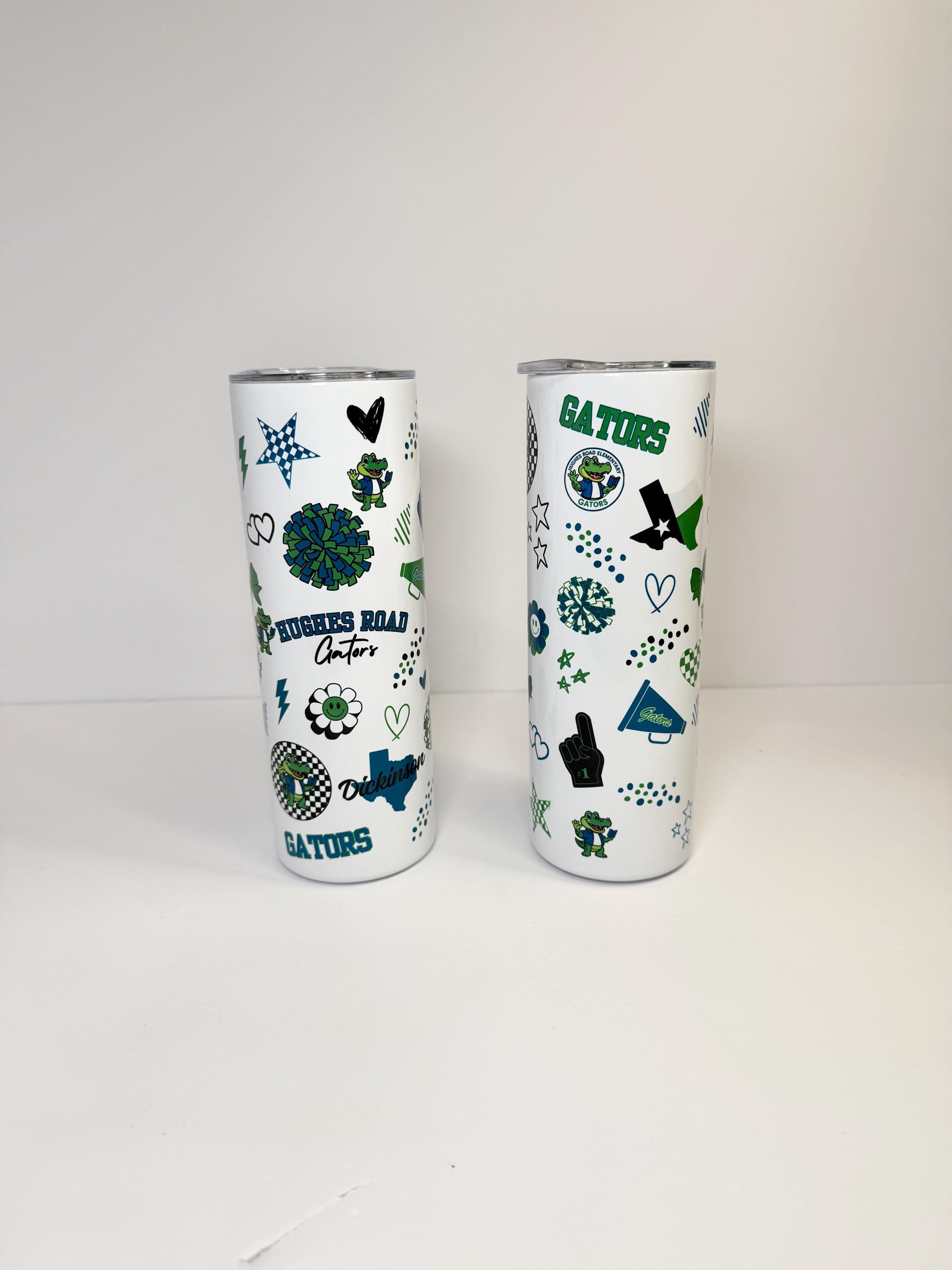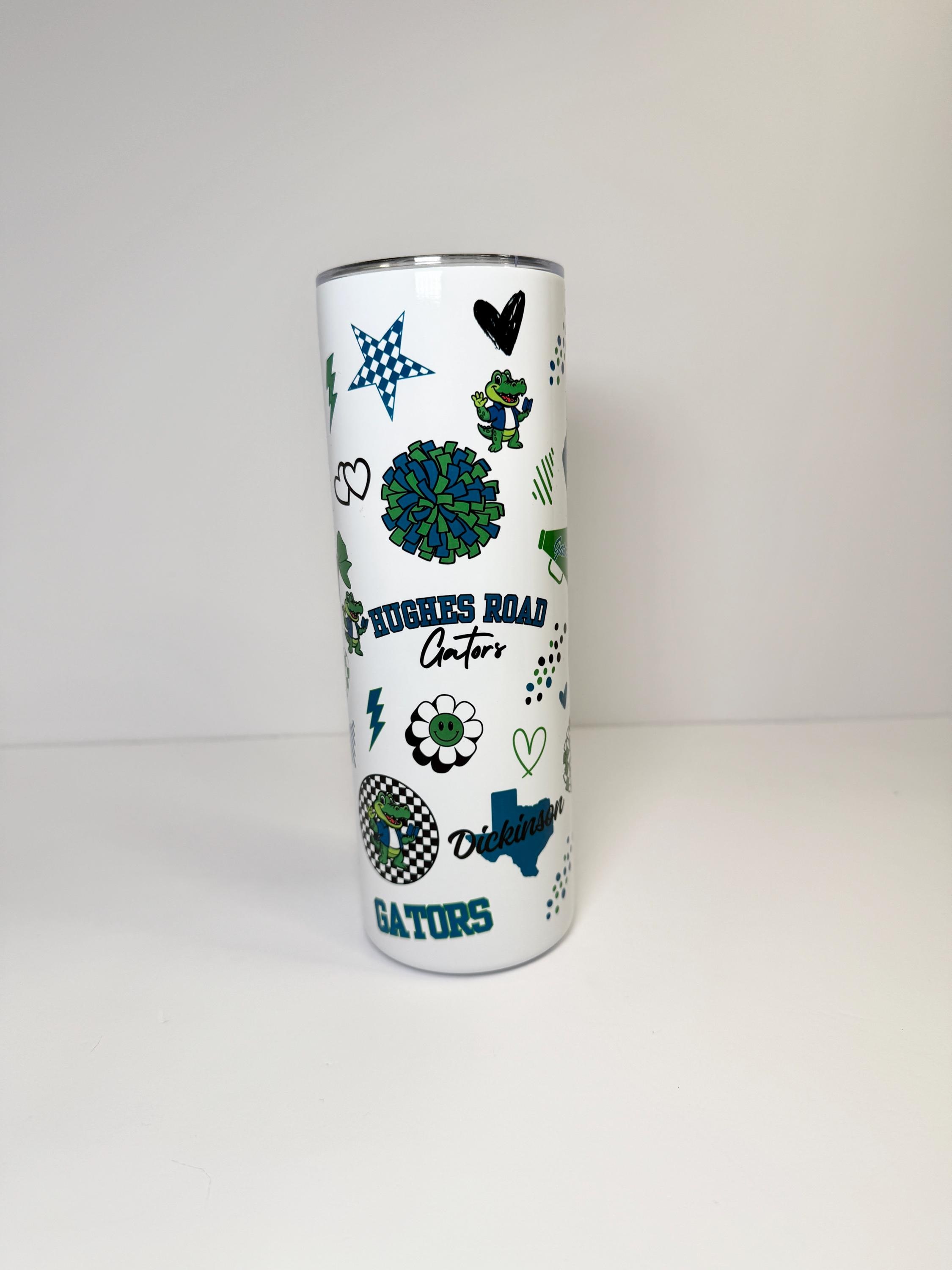 Stay hydrated in style with this Hughes Road Elementary Gators 20 oz cup! Featuring the school’s fun mascot, cheerful icons, and spirited designs, this tumbler is the perfect way to show your Gator pride every day. Each cup is designed and printed in my home workshop with vibrant, high-quality graphics that last — perfect for teachers, students, and proud Gator parents!