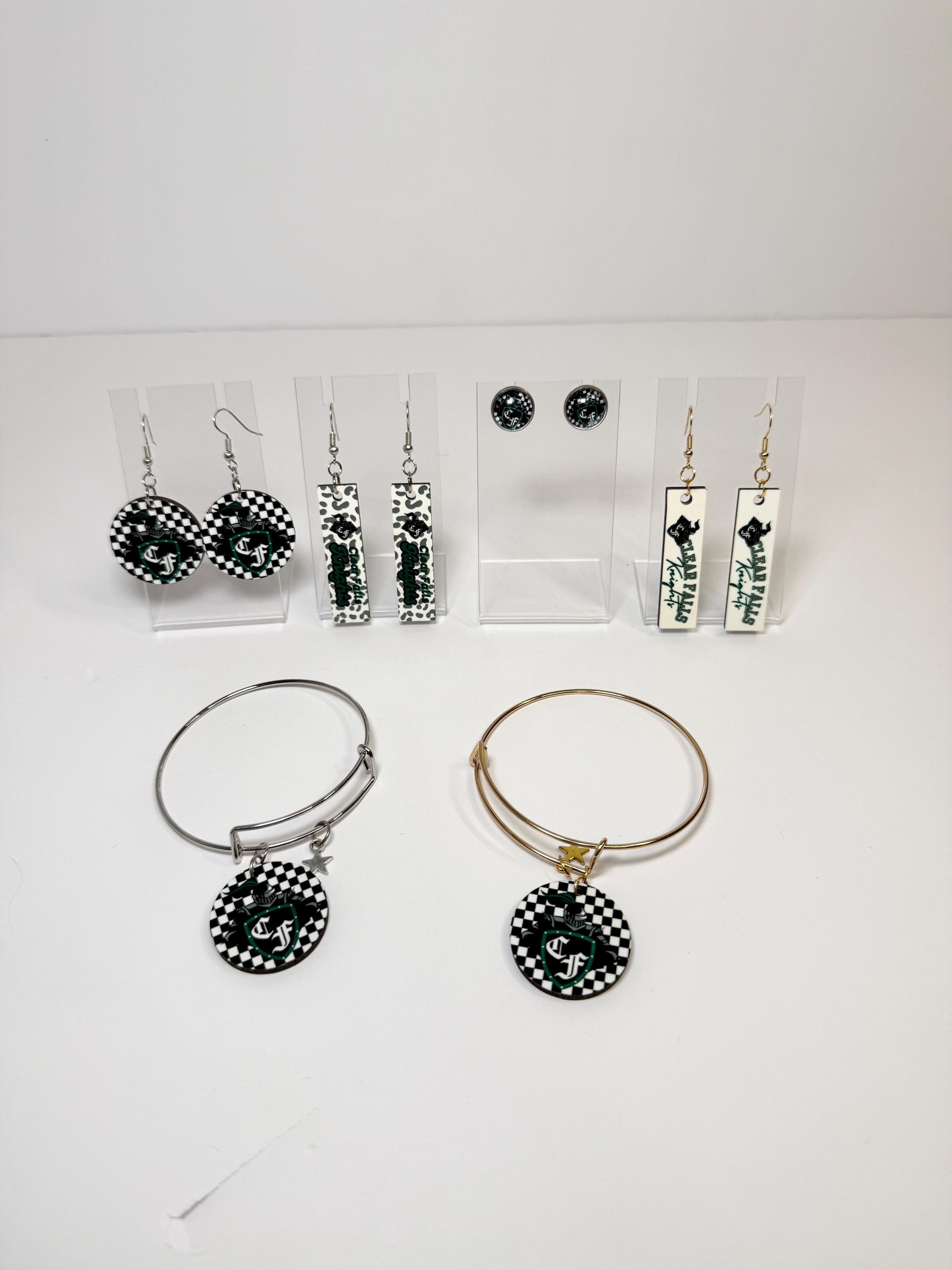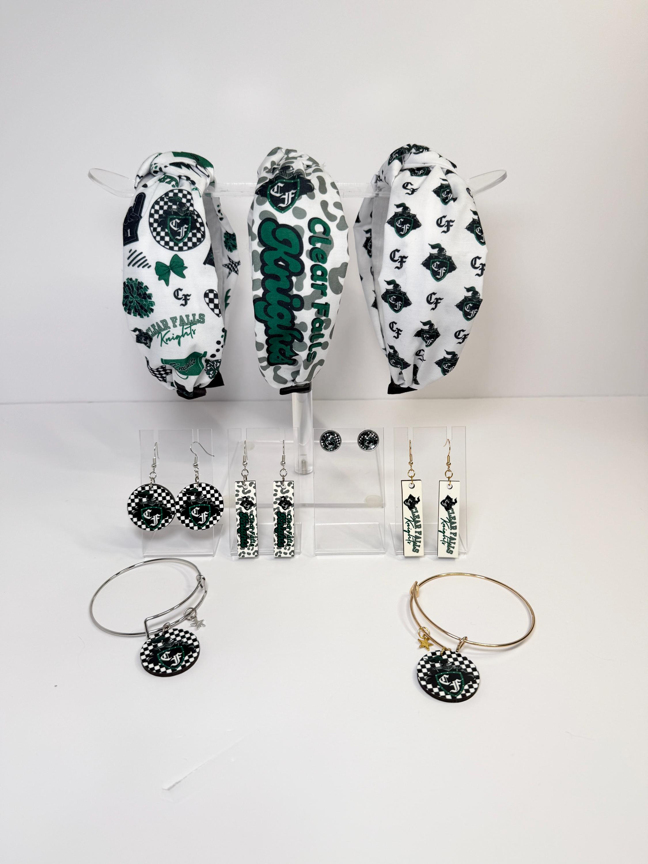 Shine bright with your Clear Falls Knights pride! Each pair of earrings and bracelet is handmade and printed by me in my home workshop to perfectly capture your school spirit. Choose from earrings or adjustable bangle charm bracelets, designed to complement any game day or spirit outfit.